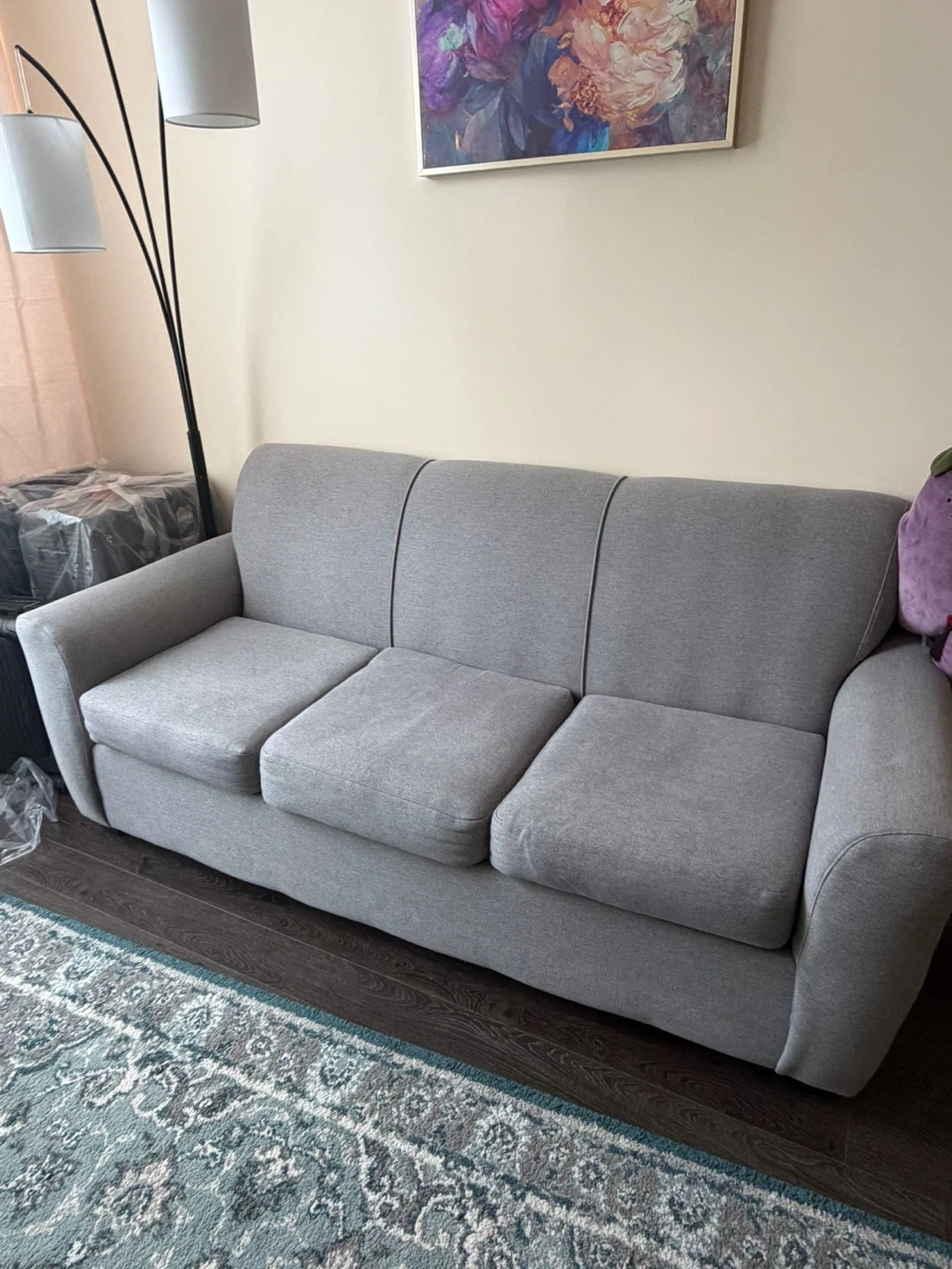 Selling a well-maintained grey fabric sofa. Clean, comfortable, and perfect for any modern living space. From a no smoking, no pet home.