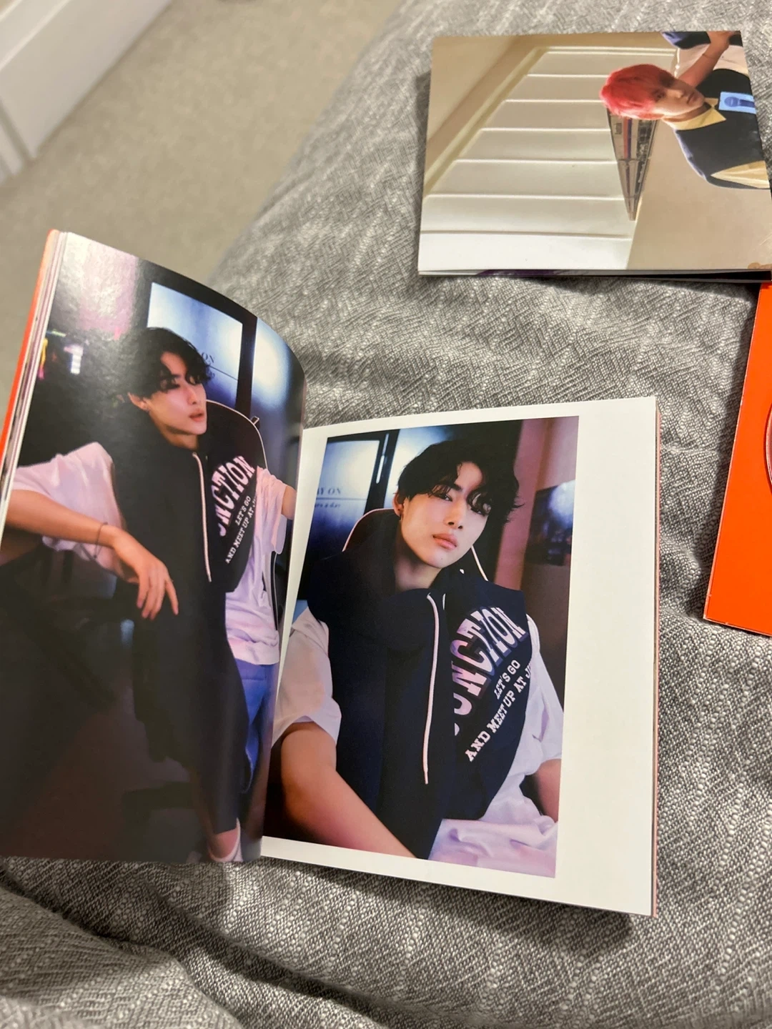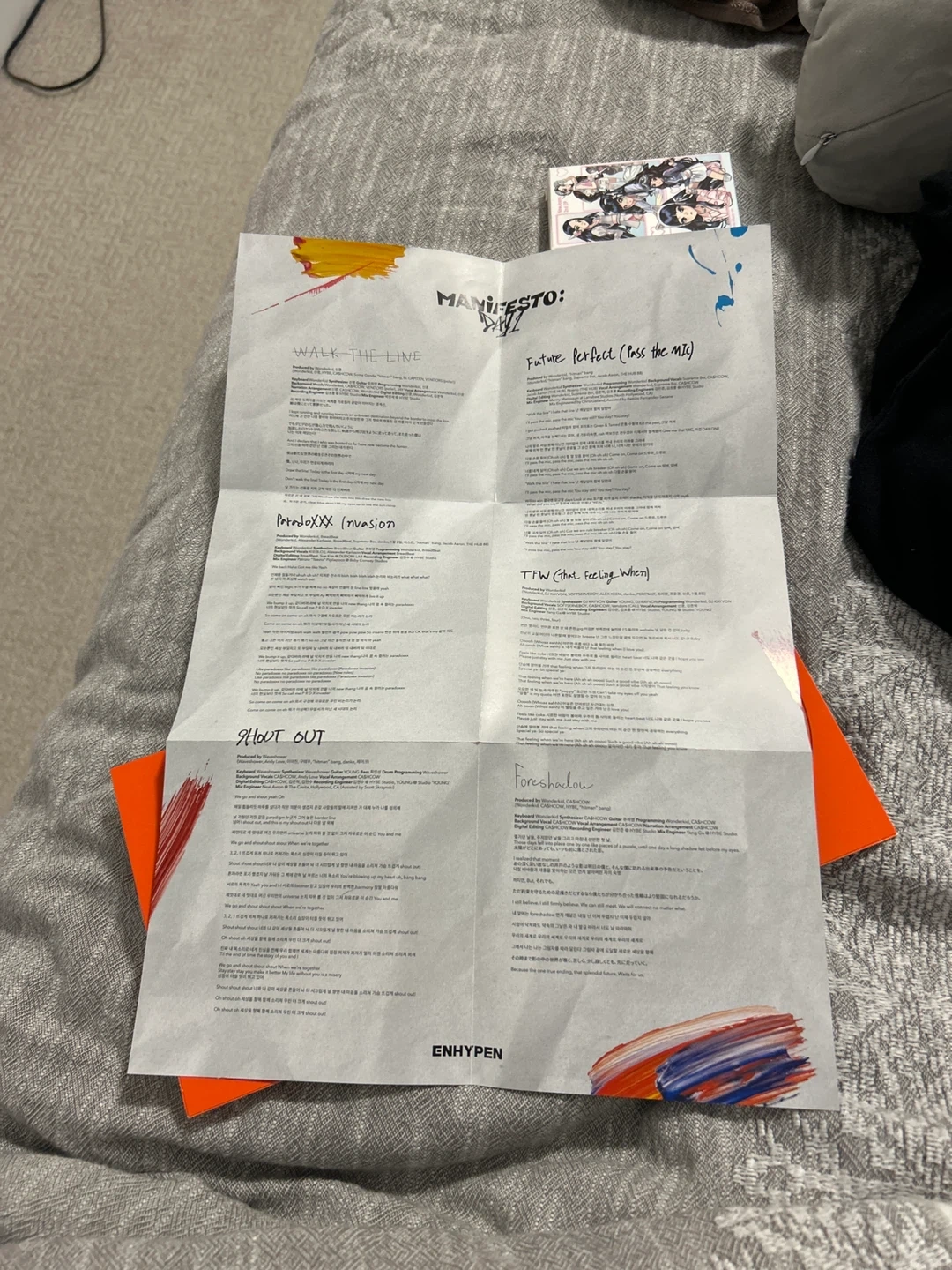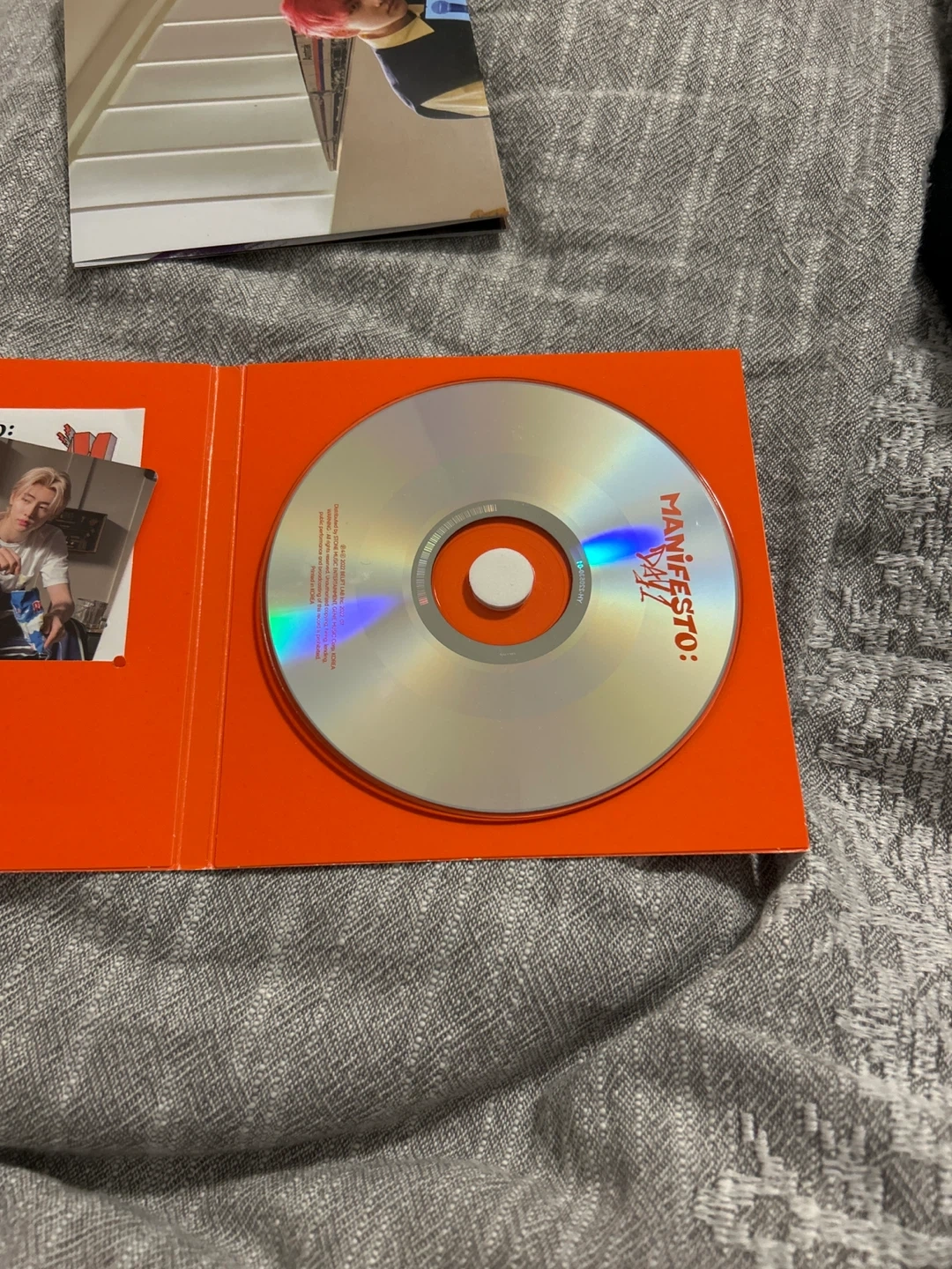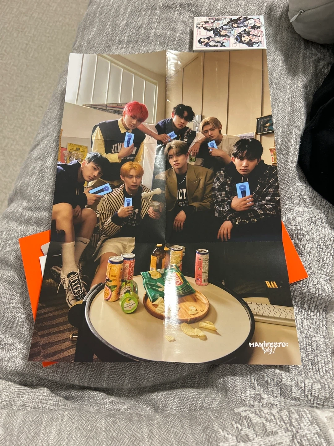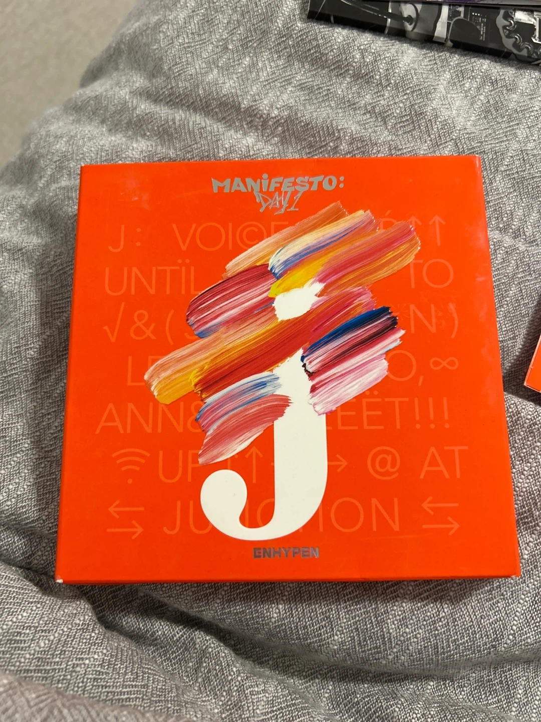 This is the ENHYPEN MANIFESTO : DAY 1 album CD. It includes a CD, photobook, stickers, and photocards. Nothing is used, there is light scuffing on the cover of the container at the back, and a little (normal and came like this) creasing on the poster where it was folded how it came.