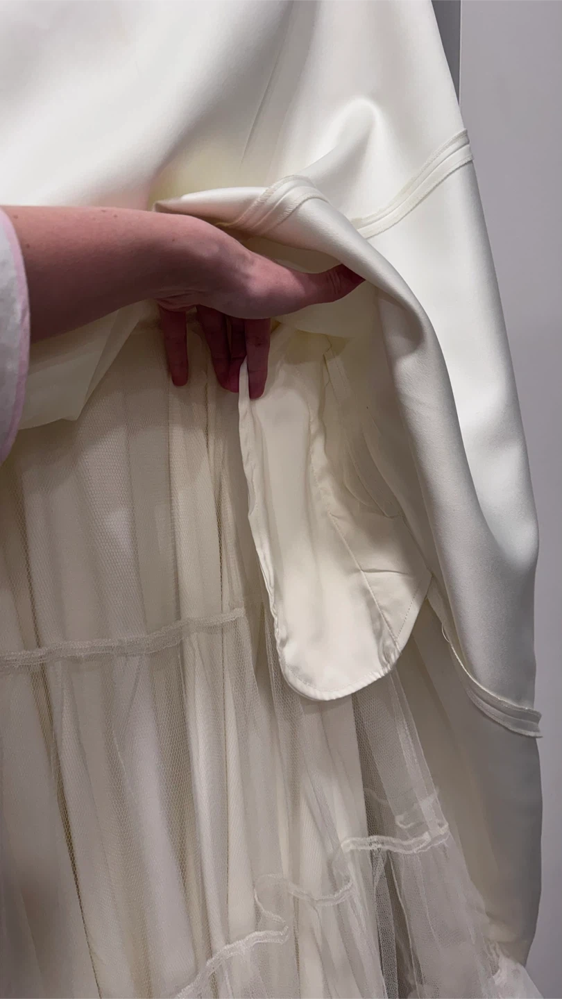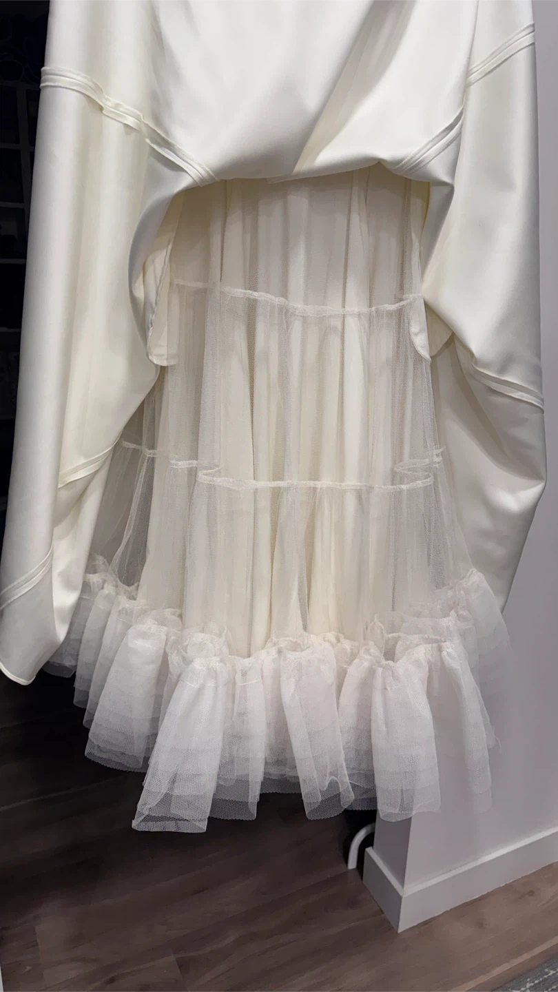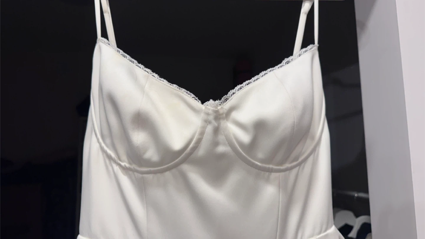 Details: Soft ivory tone, minimal stretch, fully lined for comfort, adjustable straps, zip-up back, pockets (!), comes in original box.