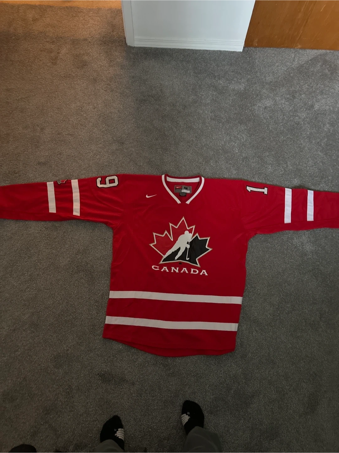 Selling a Nike Team Canada hockey jersey in size medium. It's red with white stripes and features the iconic maple leaf logo on the front. The back has "Thornton" and the number 19. A great piece for any hockey fan!