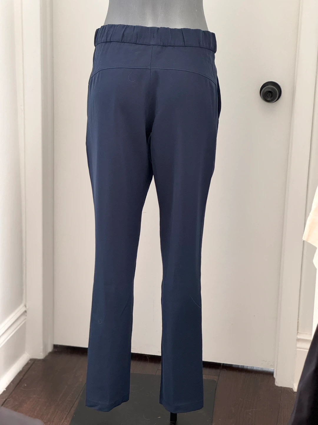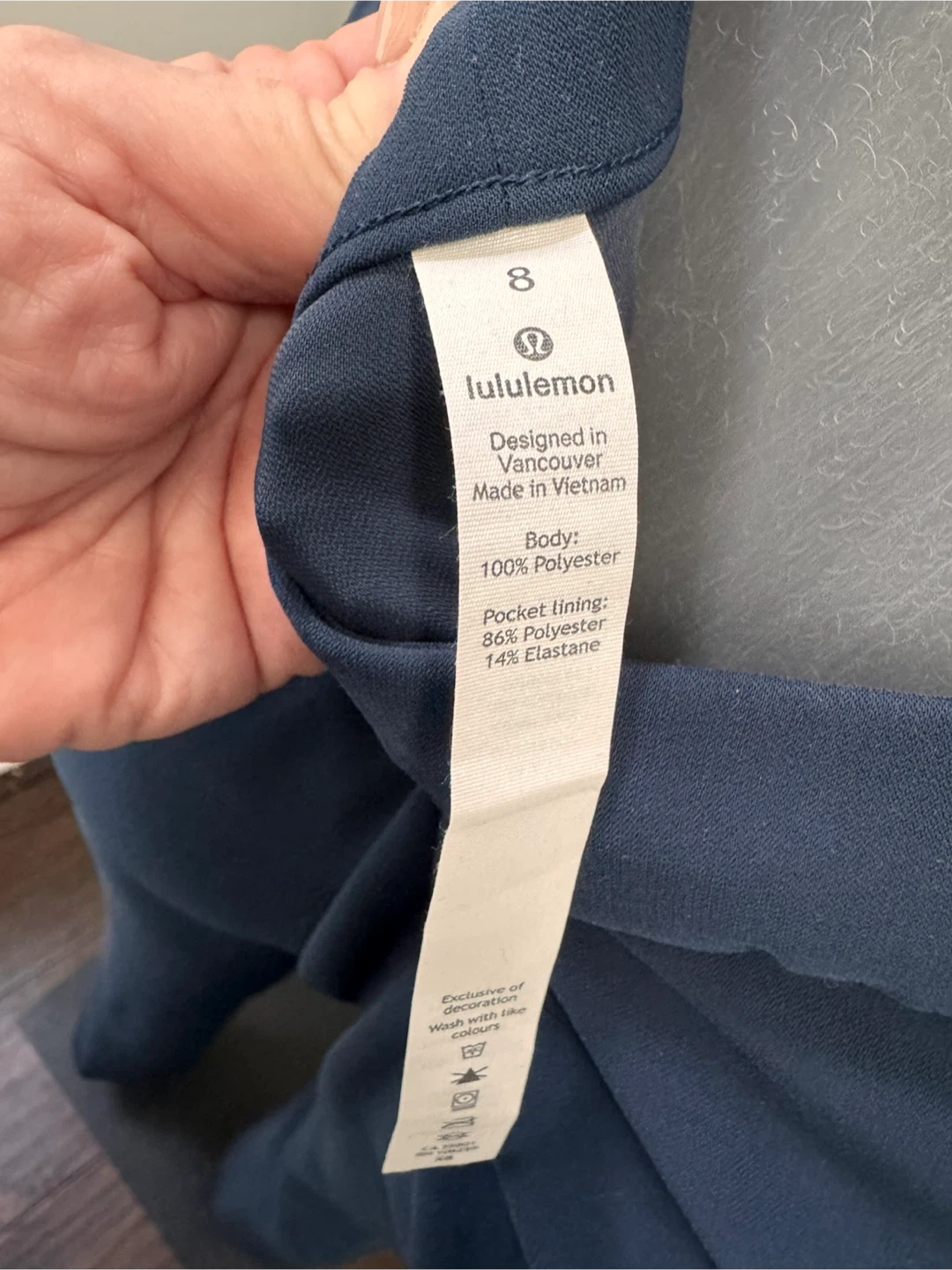 Lululemon pants in a navy blue colour. Size 8. Body is 100% polyester, pocket lining is 86% polyester and 14% elastane.