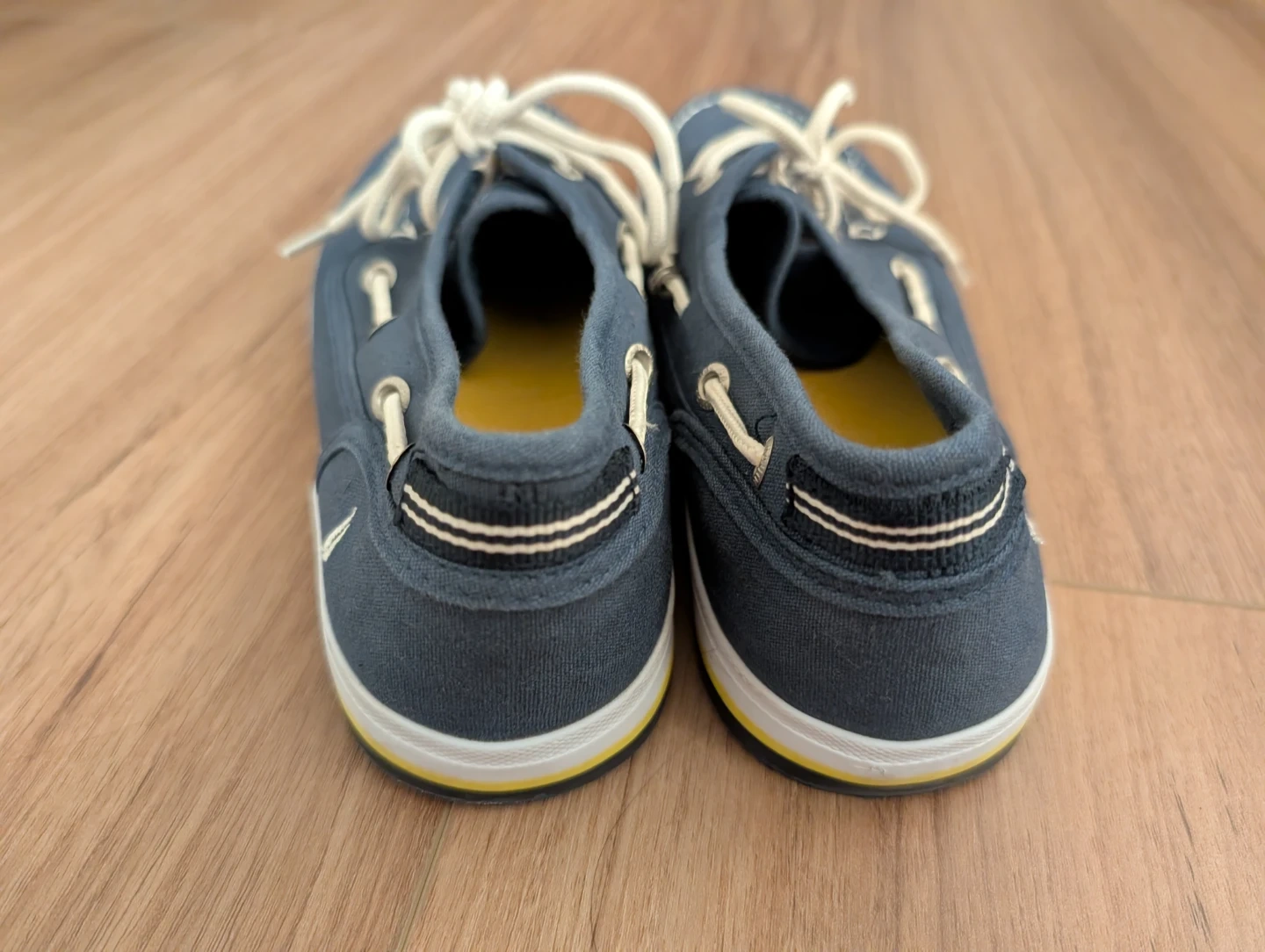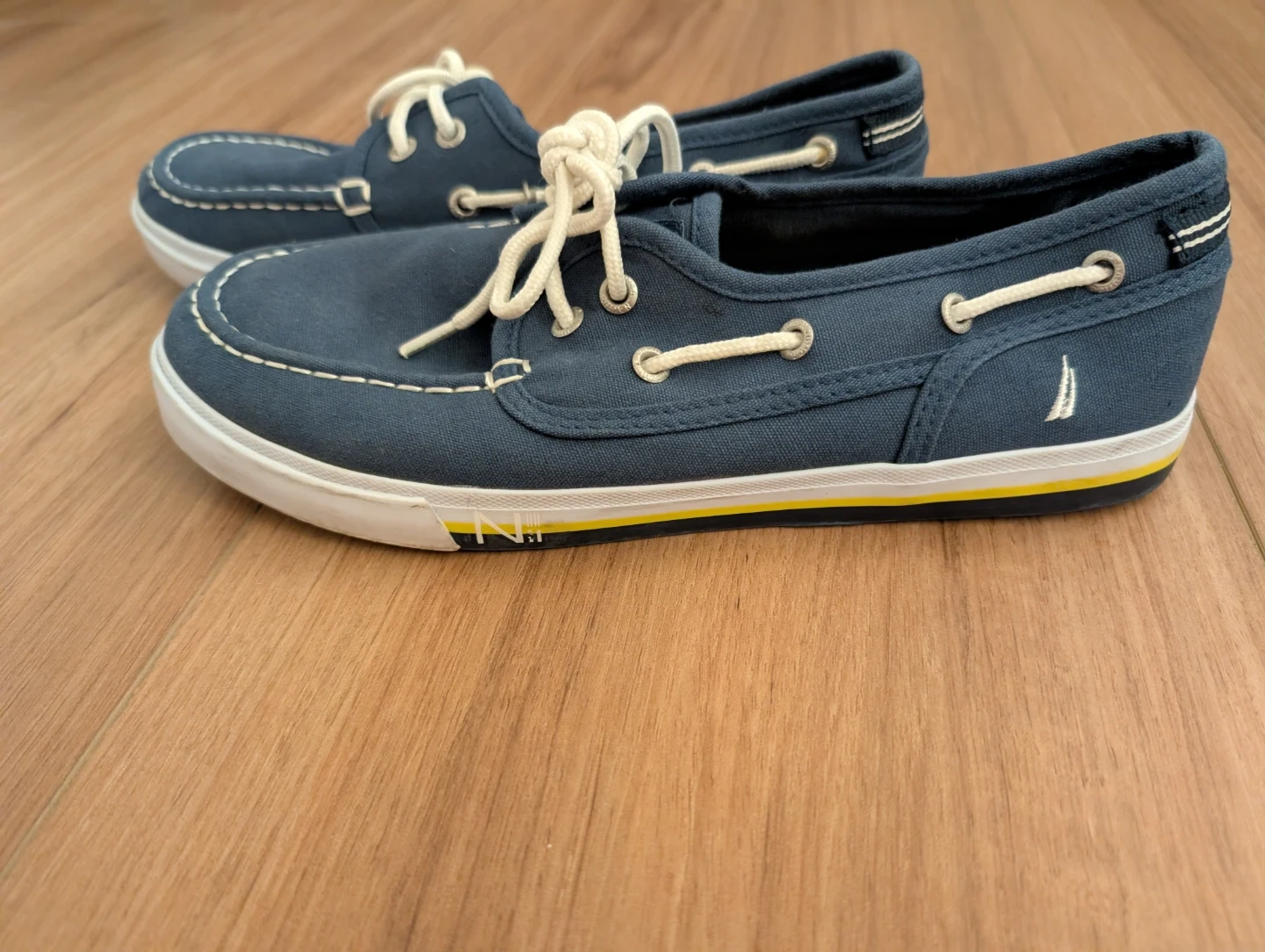 Nautica boat shoes in a deep blue canvas. These shoes feature classic styling with white laces and contrast stitching. They have a durable rubber sole and a comfortable yellow interior.
