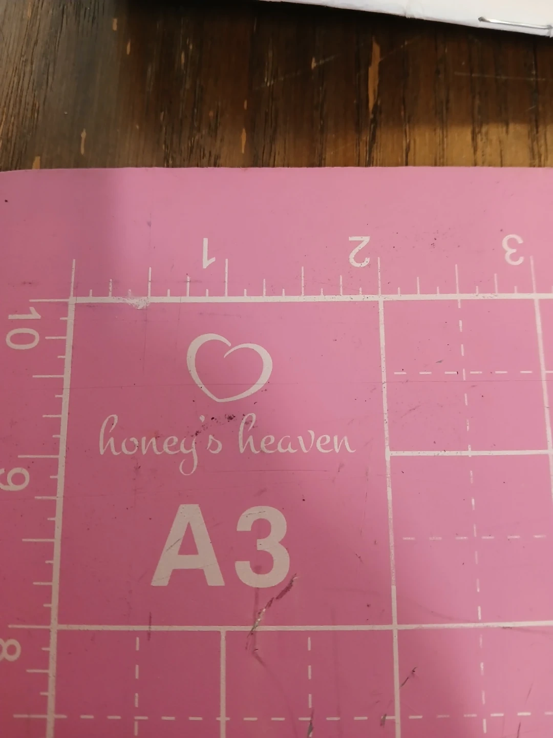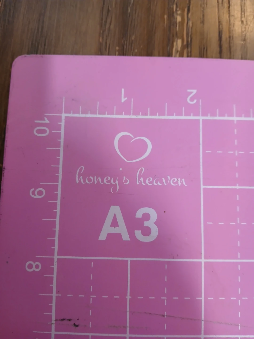 This is an A3 cutting mat from Honey's Heaven. It's pink and features a grid pattern with angle guides. Its self-healing surface protects your work area.
