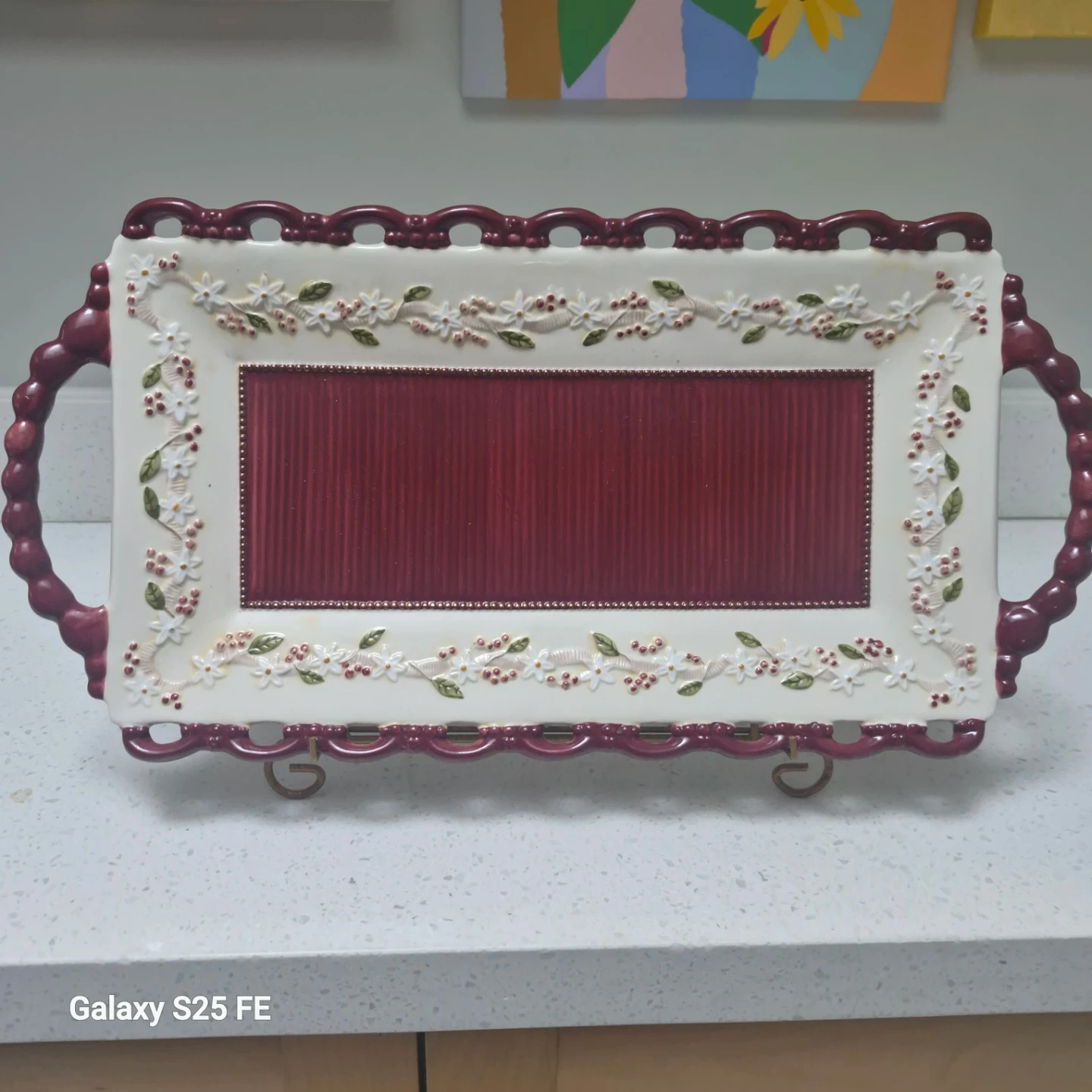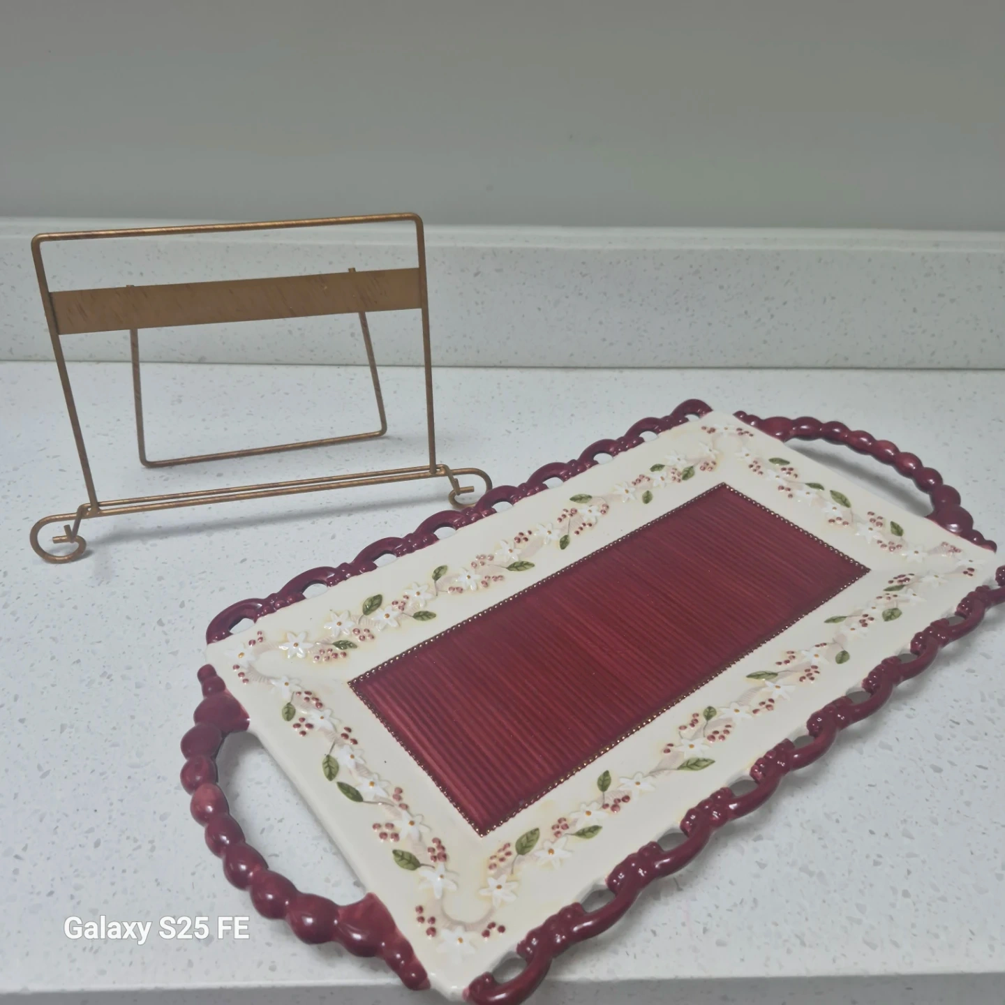 Rectangular serving tray featuring a decorative floral border and ribbed centre. Comes with a metal stand. This tray's elegant design makes it suitable for serving treats at gatherings.