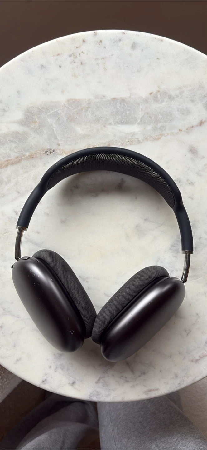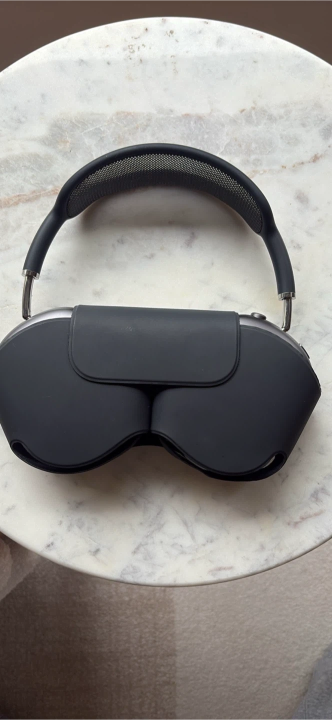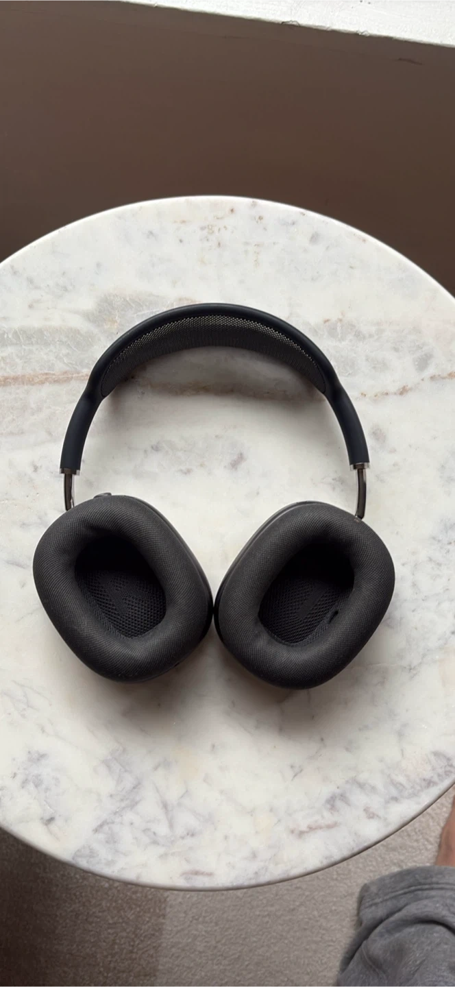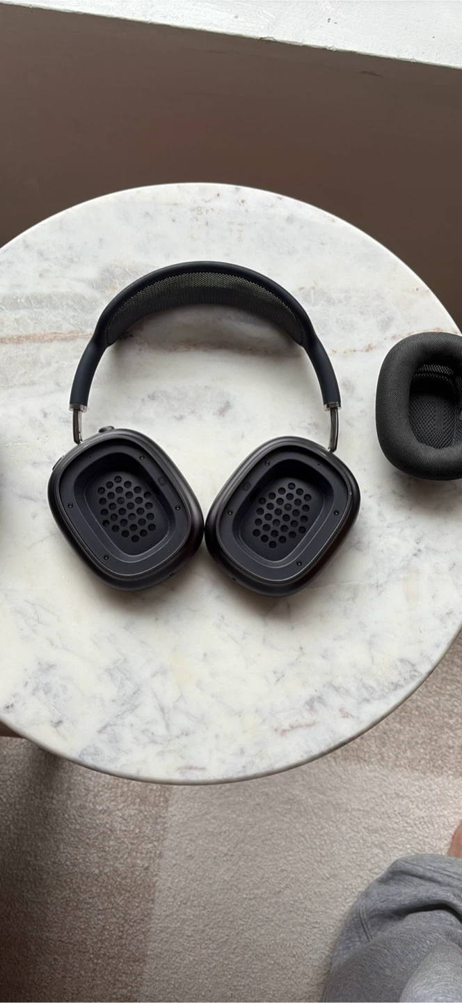 These are Apple AirPods Max in space grey. They offer active noise cancellation and transparency mode. The ear cushions are removable for cleaning or replacement.