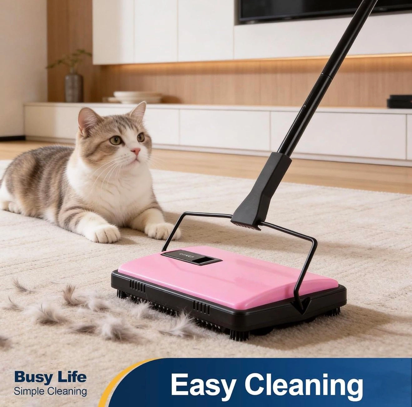 Lightweight, non-electric hand-push sweeper for home or office. Great for low and undercoat carpets, rugs, and picking up pet hair, dust, scraps, paper, and small rubbish. Comes with an extra brush.