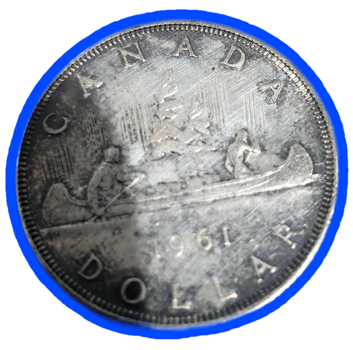 That is a 1961Canadian "Voyageur" Silver Dollar. It’s a classic piece of Canadian numismatic history, featuring a voyageur and an Indigenous person paddling a birch-bark canoe.