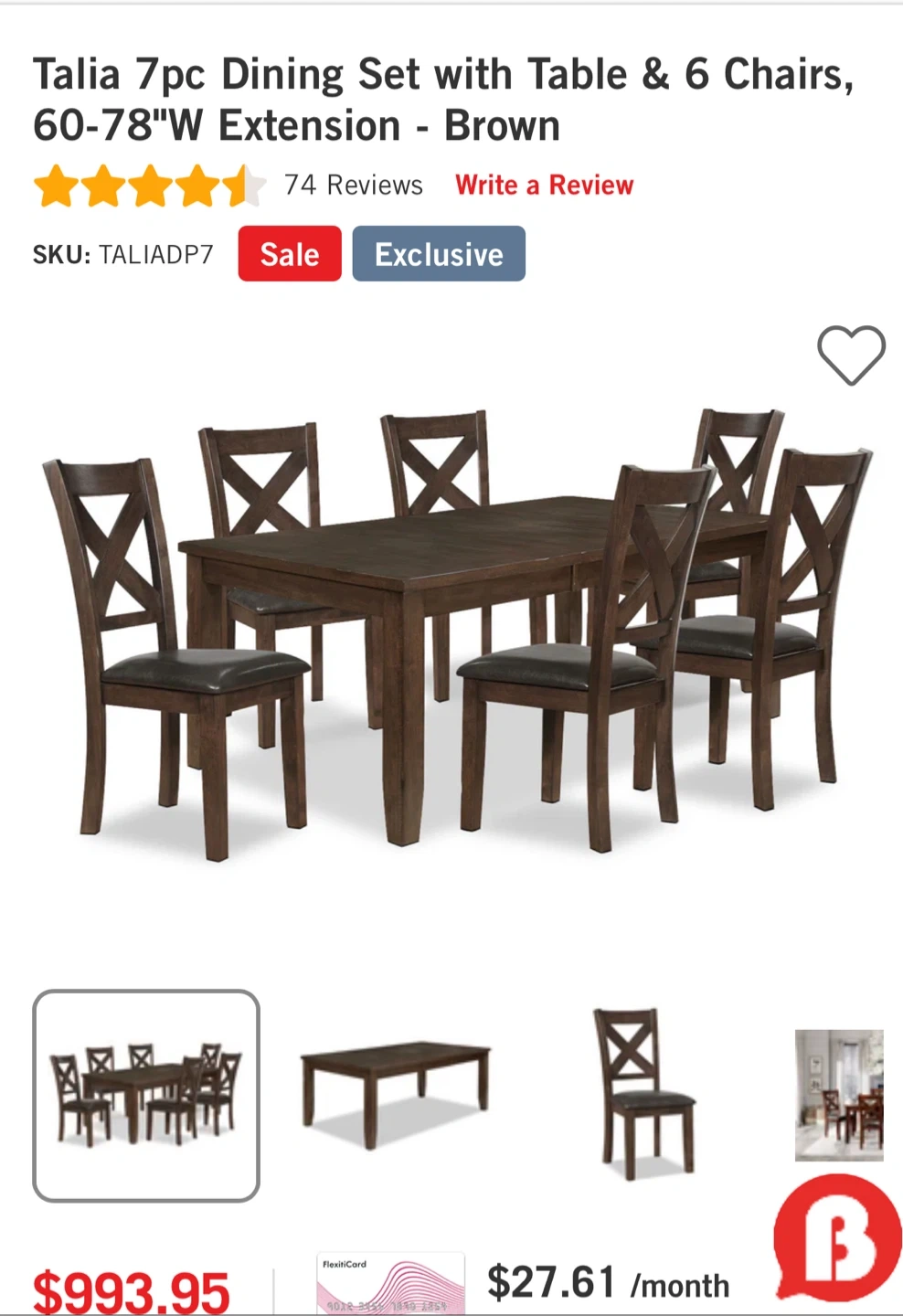 Selling a Talia 7-piece dining set, which includes a table and six chairs. The set features a 60-78"W extension and comes in a brown finish. Originally bought for $993.95