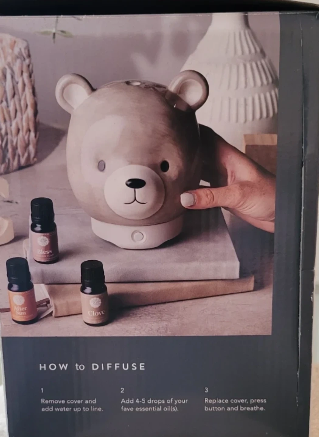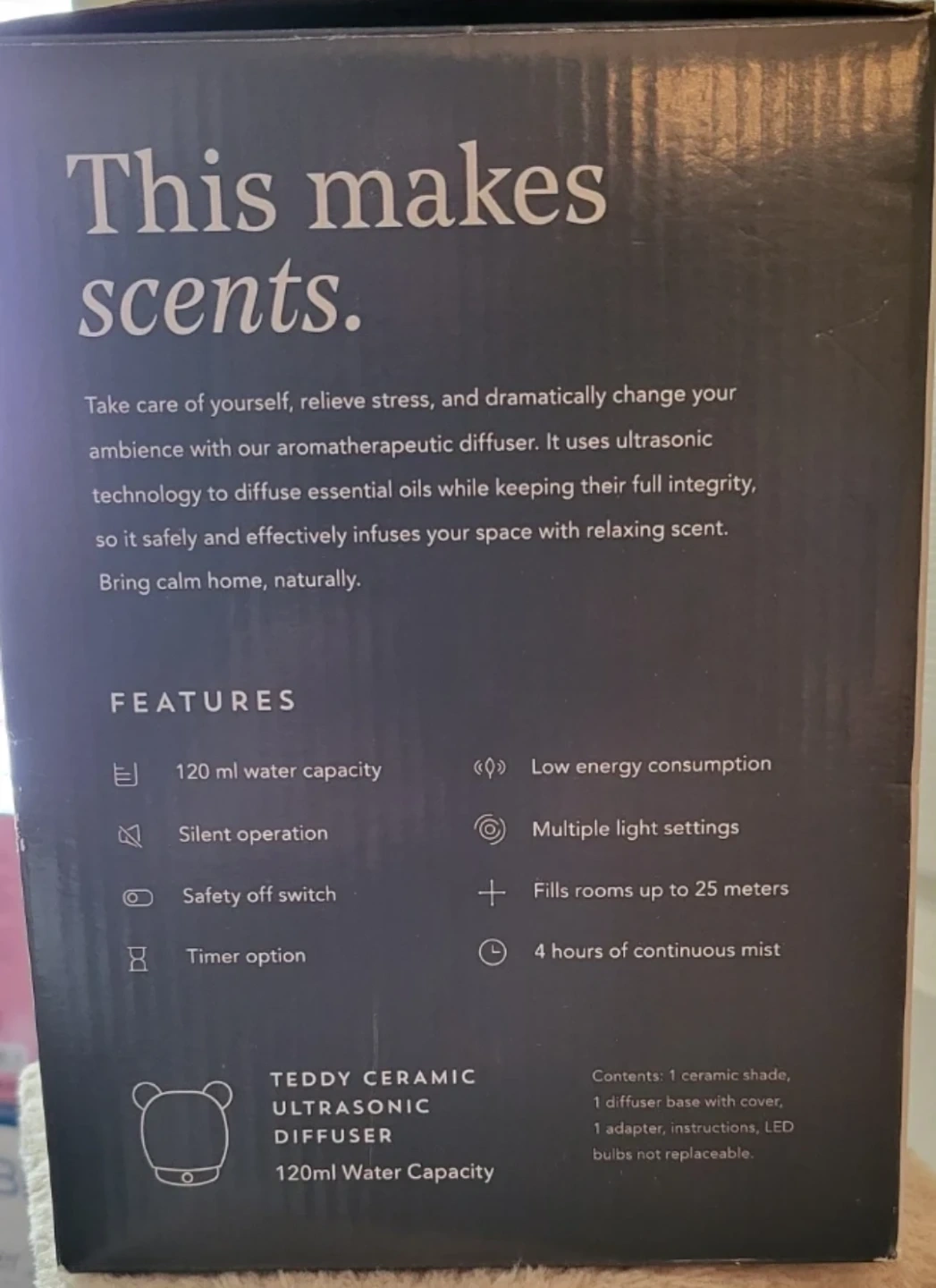 This new Woolzies Teddy Ceramic Ultrasonic Diffuser has a 120ml water capacity and provides silent operation with a safety off switch. It offers multiple light settings and a timer option. This diffuser fills rooms up to 25 meters and runs for 4 hours of continuous mist. It comes with a ceramic shade, diffuser base with cover, adapter, and instructions.