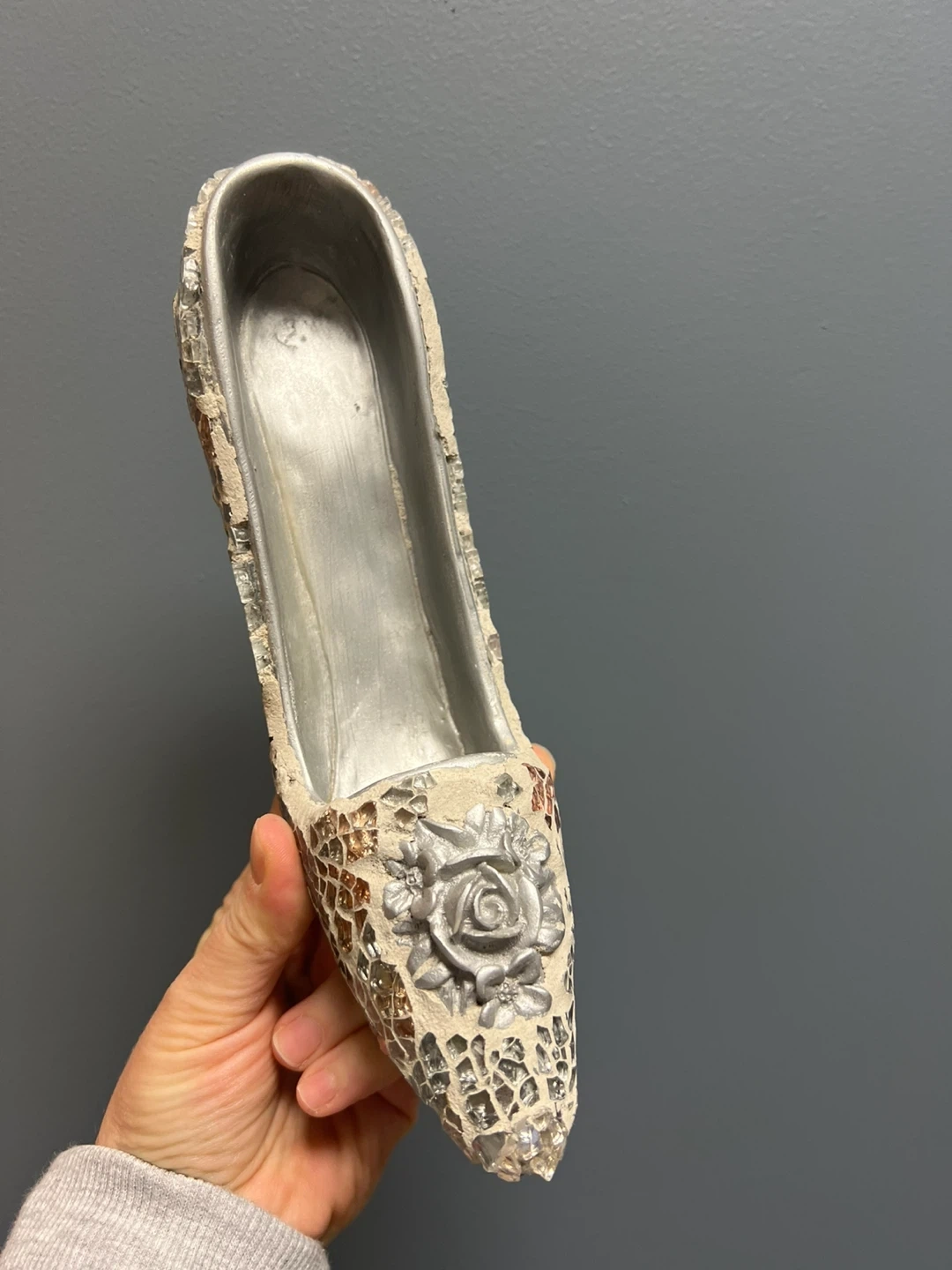 This is a decorative high heel shoe figurine with a mosaic tile finish. It features intricate detailing with a rose embellishment on the toe. It's suitable for display or as a unique accent piece.