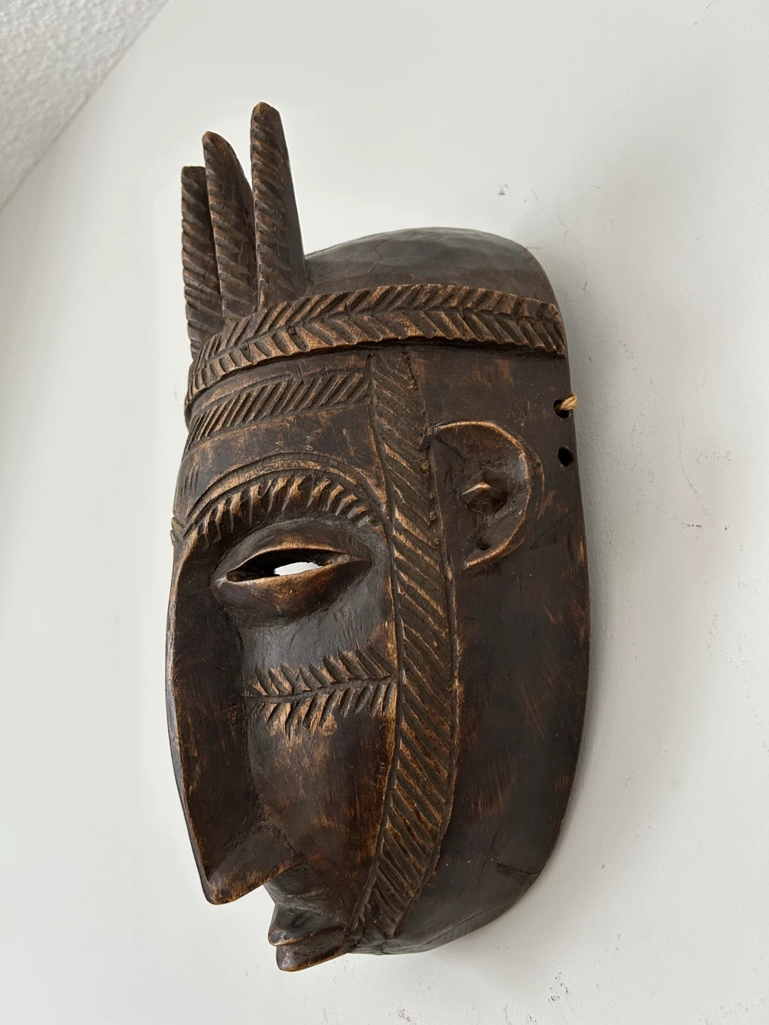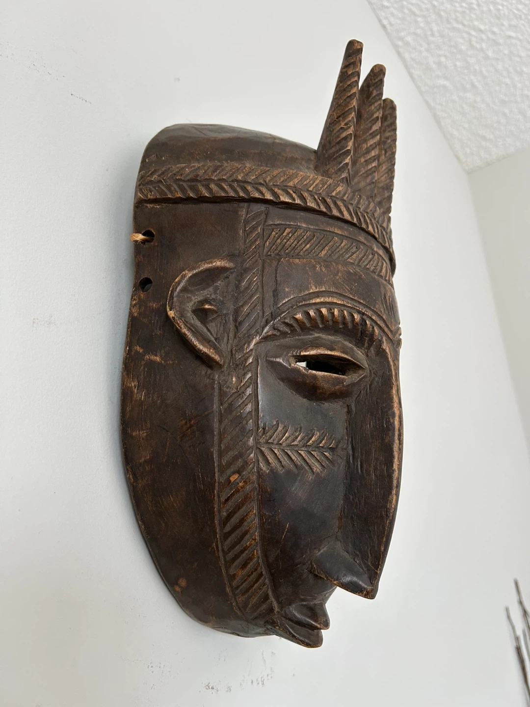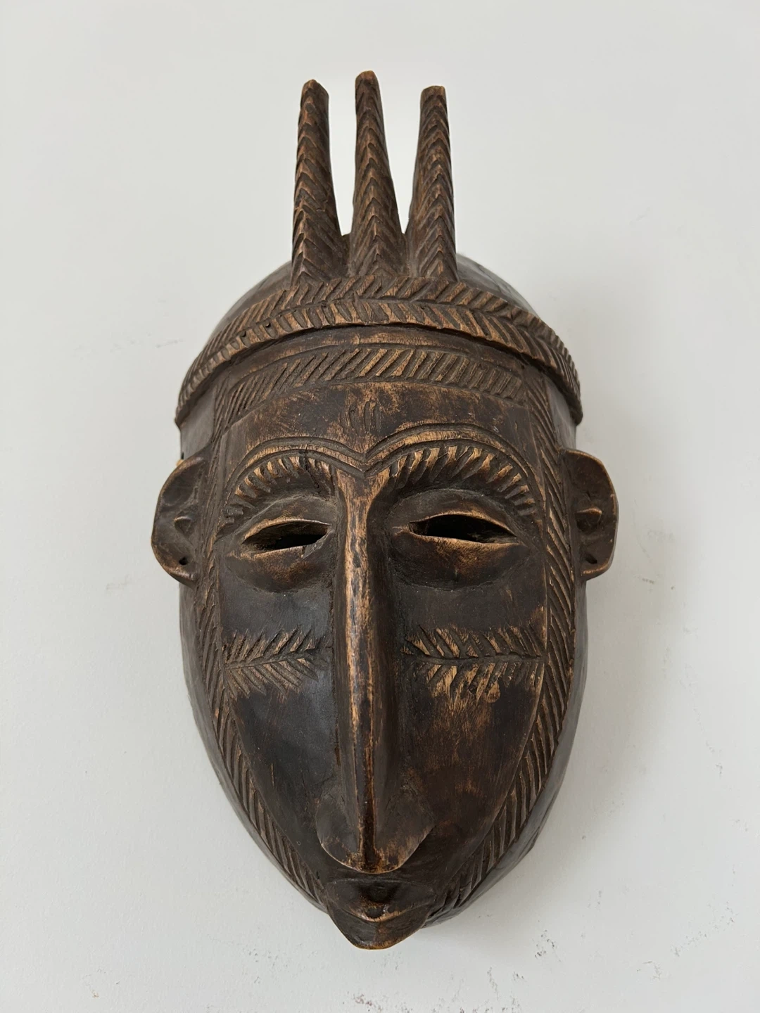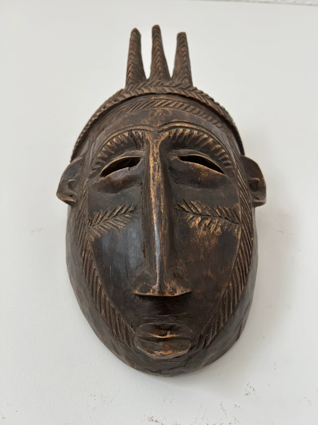 This beautifully sculpted piece features an elongated face, three vertical spikes above the head, and detailed geometric scarification carvings on the forehead and cheeks — classic elements associated with N’tomo symbolism and early initiation traditions. The dark-stained wood has a rich natural patina that enhances its depth and character. Original hanging twine is still attached on the back.