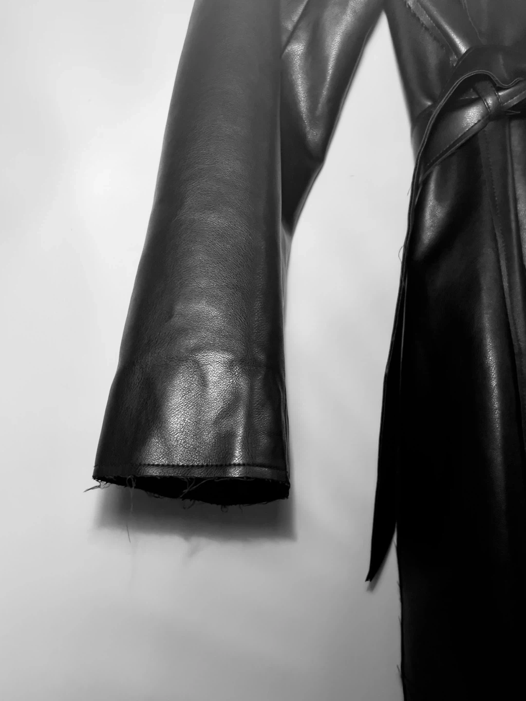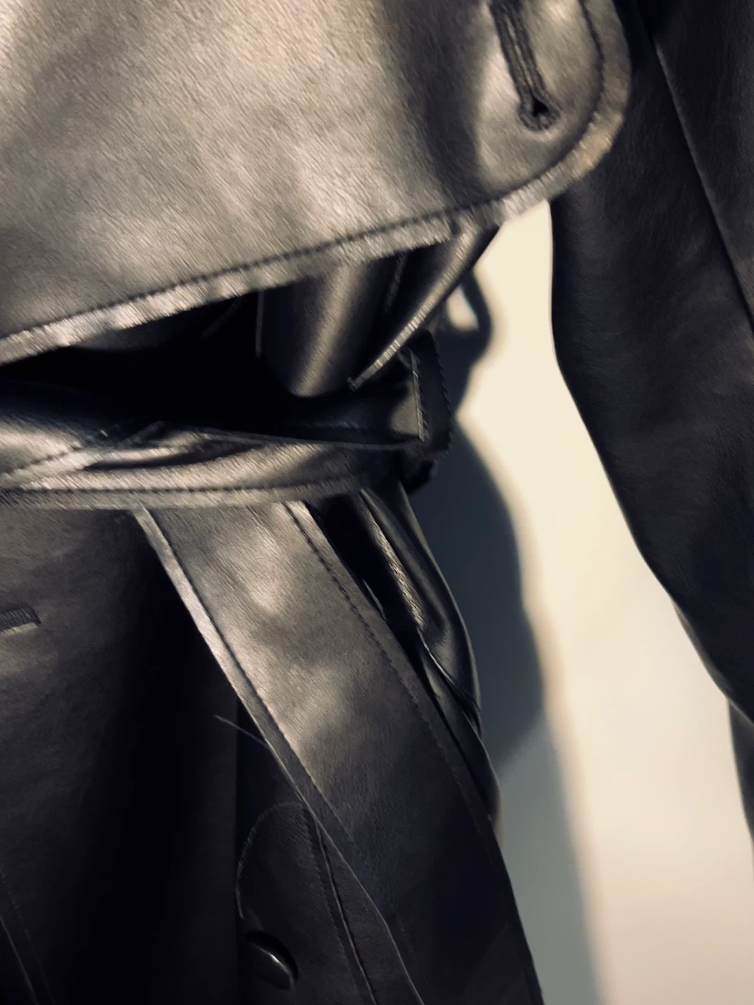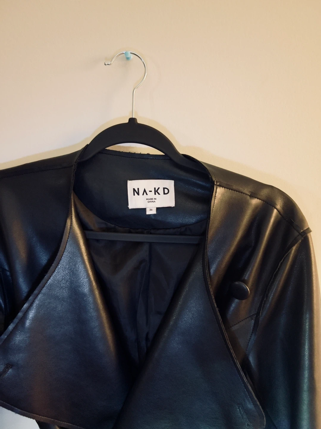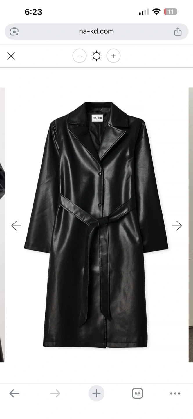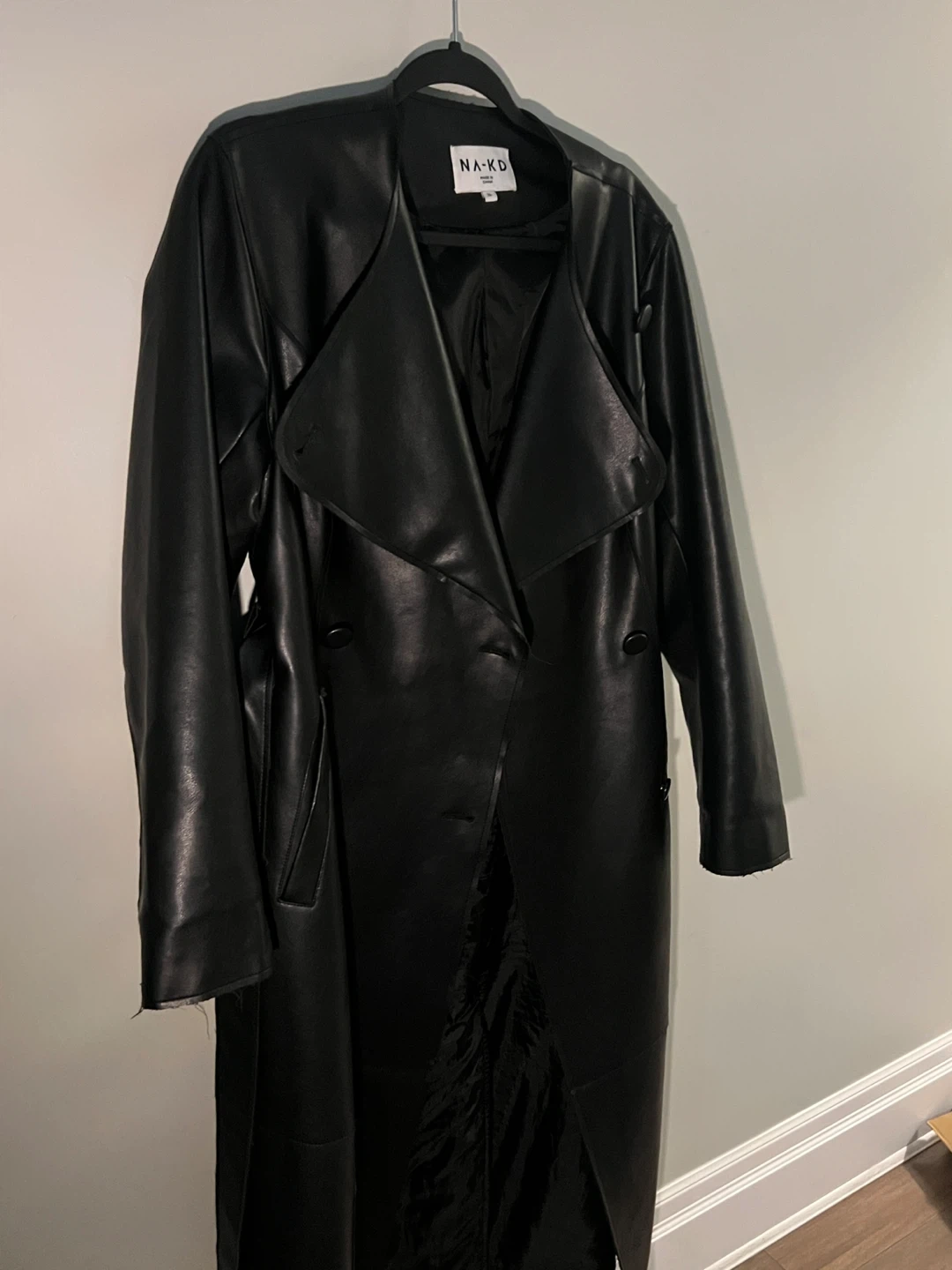 A sleek black faux leather trench coat by NA-KD. It features a tie waist and a classic collar. Longline, oversized fit. Size Small. Perfect for autumn & spring.