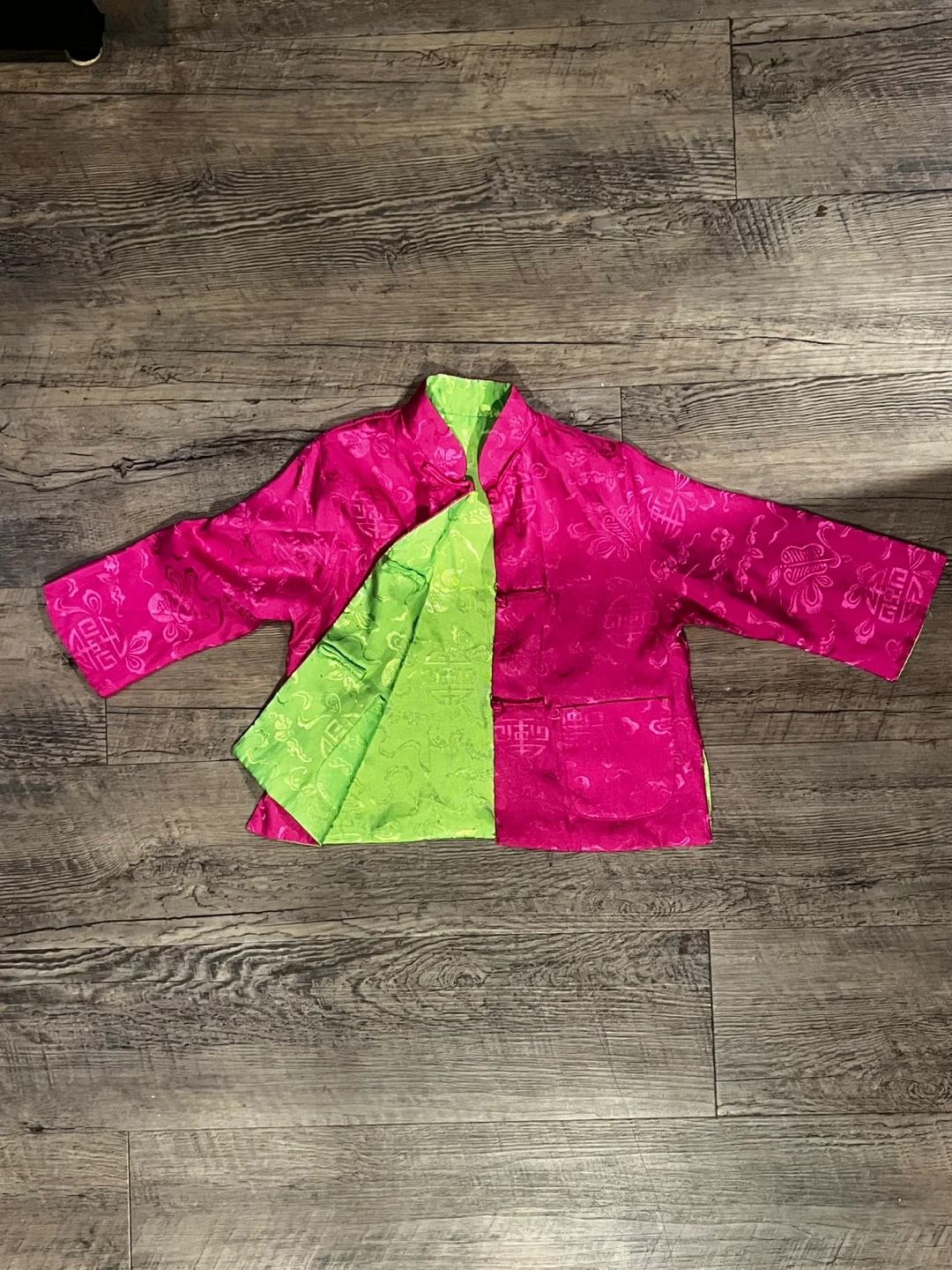 Chinese traditional clothes.This kids jacket is reversible with a vibrant pink outer and a bright green inner. It features a traditional Chinese knot button closure and a patterned fabric. It's made of a silky material with embossed designs.