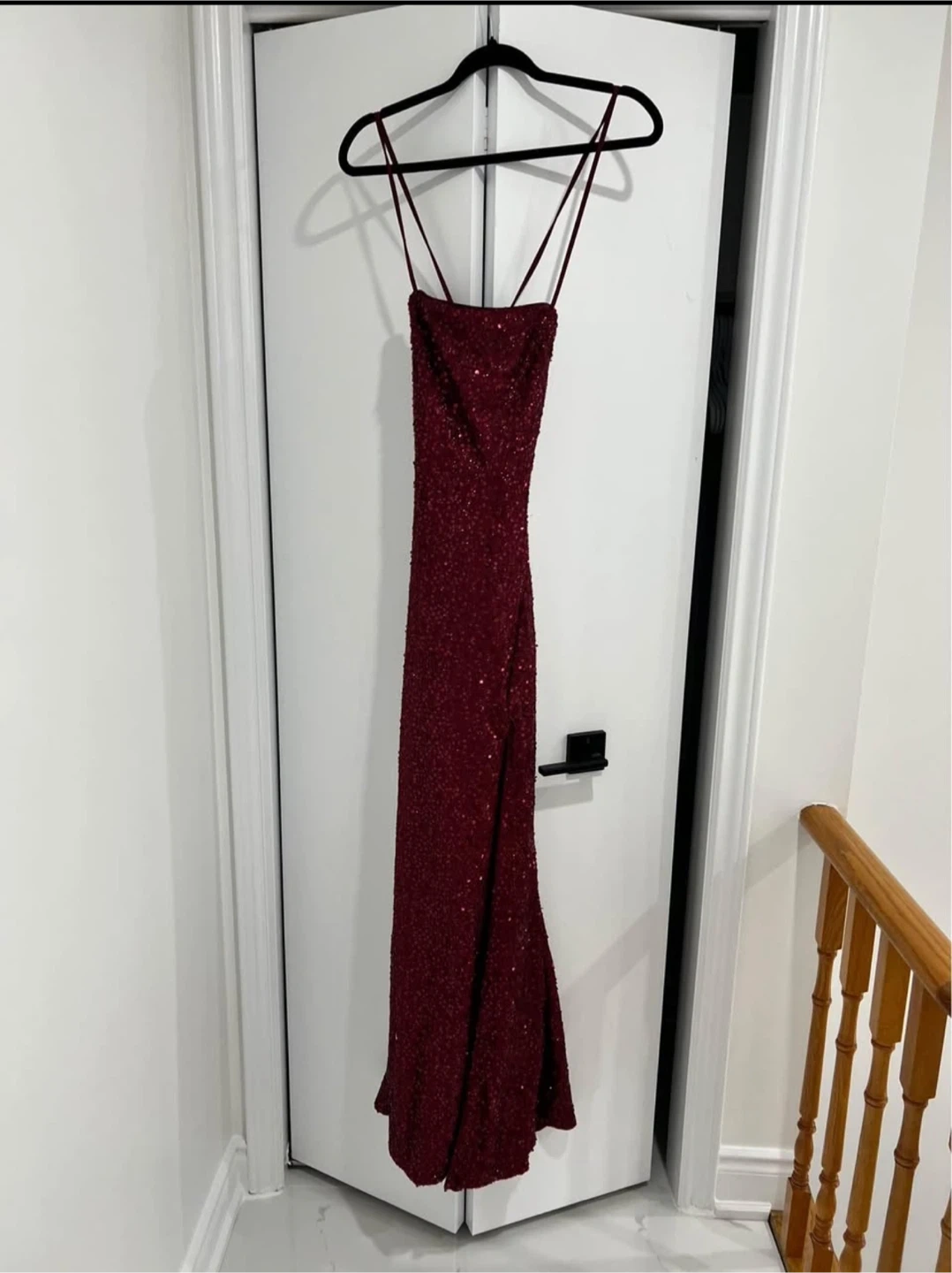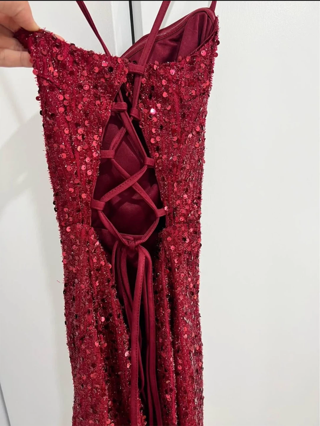 Selling a beautiful burgundy sequin formal dress. It features a strappy back and a side slit. Perfect for a special occasion!