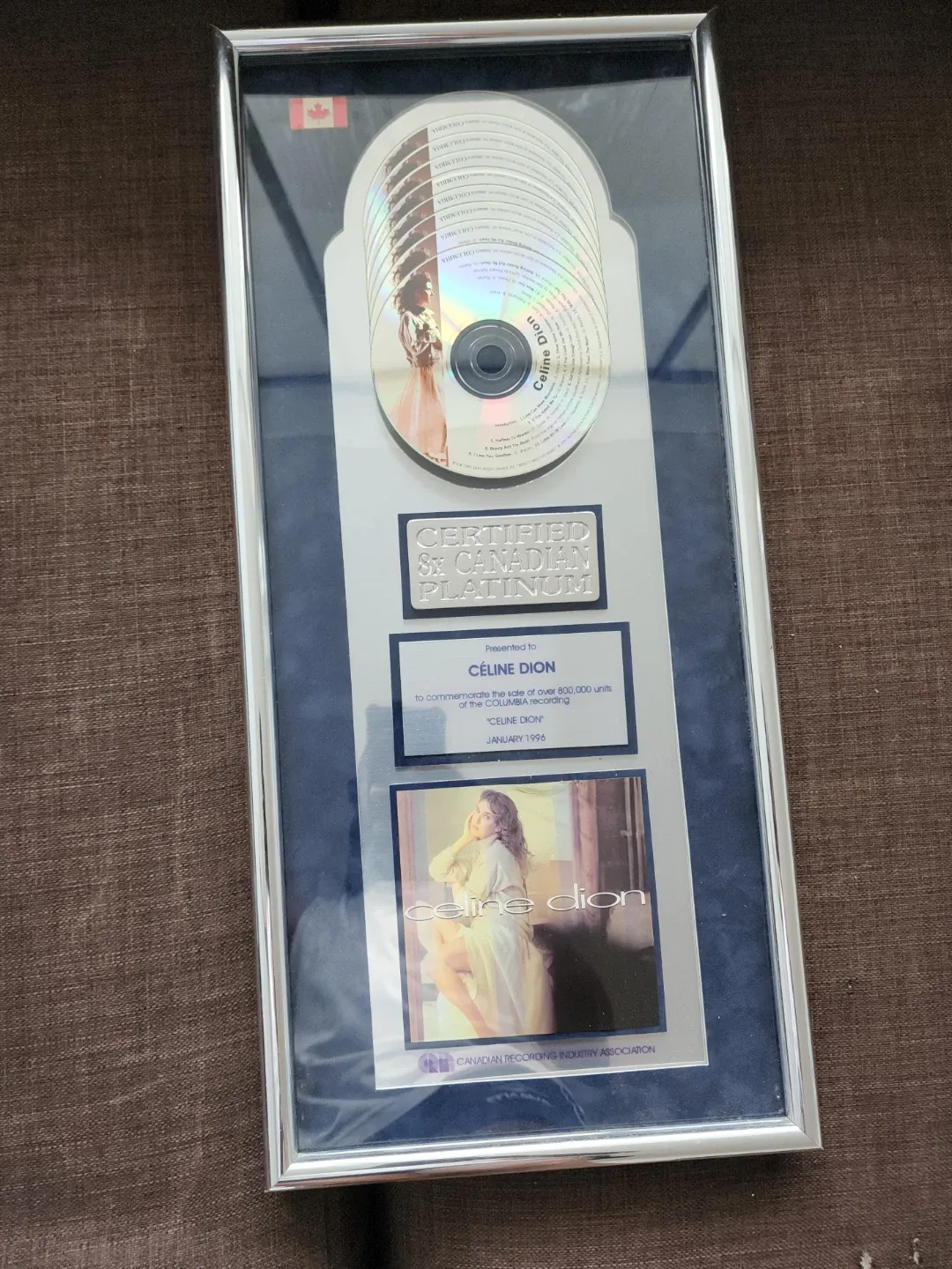 This framed award commemorates the sale of over 800,000 units of Celine Dion's "Celine Dion" Columbia recording. It's certified Canadian Platinum by the Canadian Recording Industry Association. Awarded January 1996.
