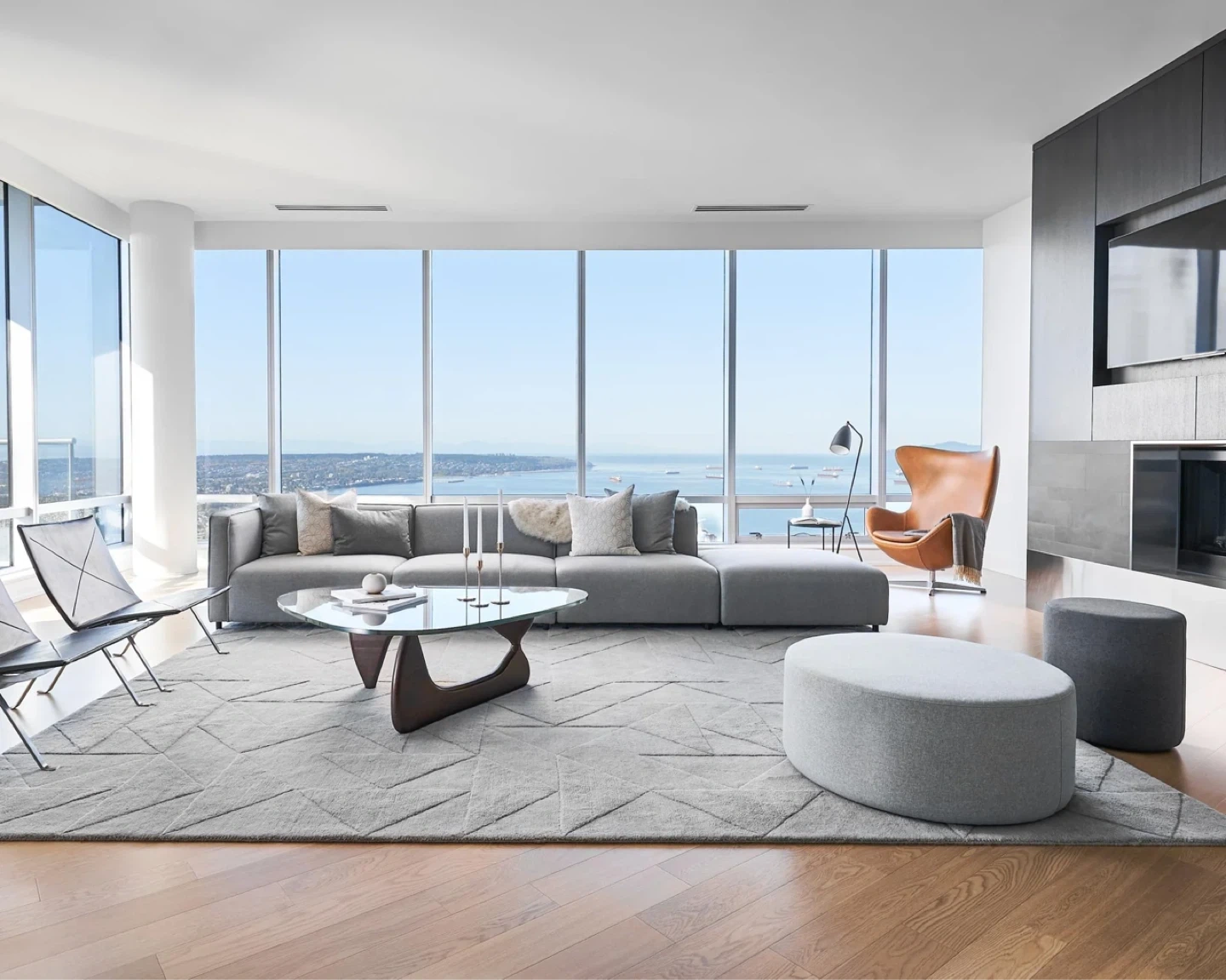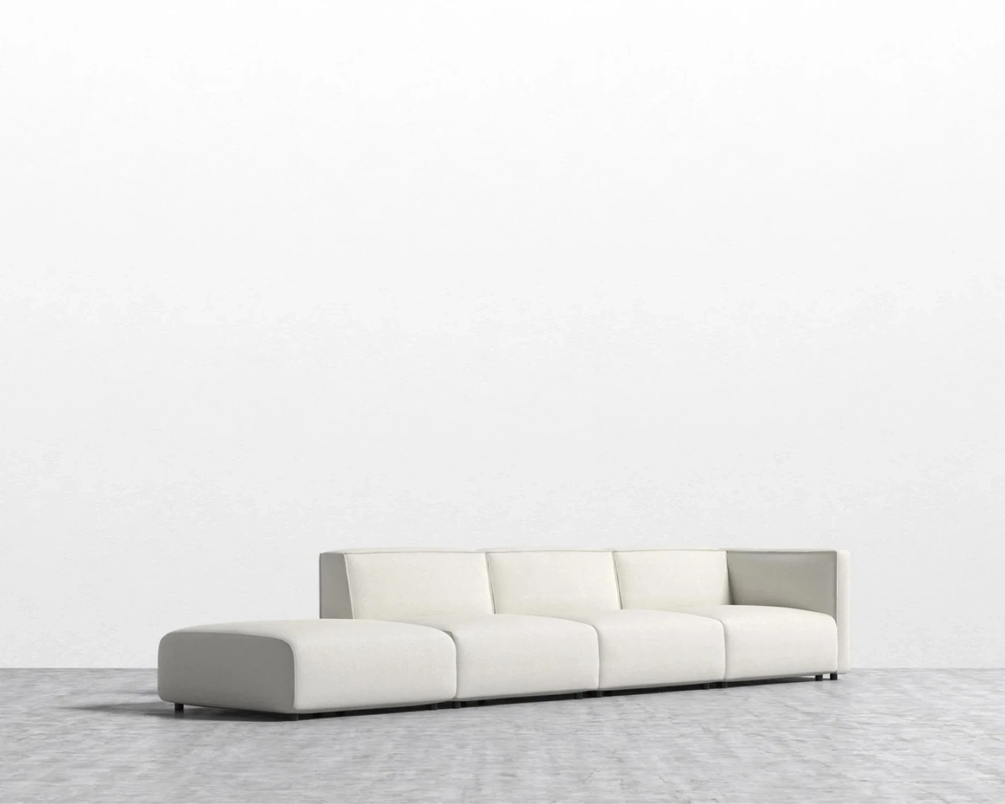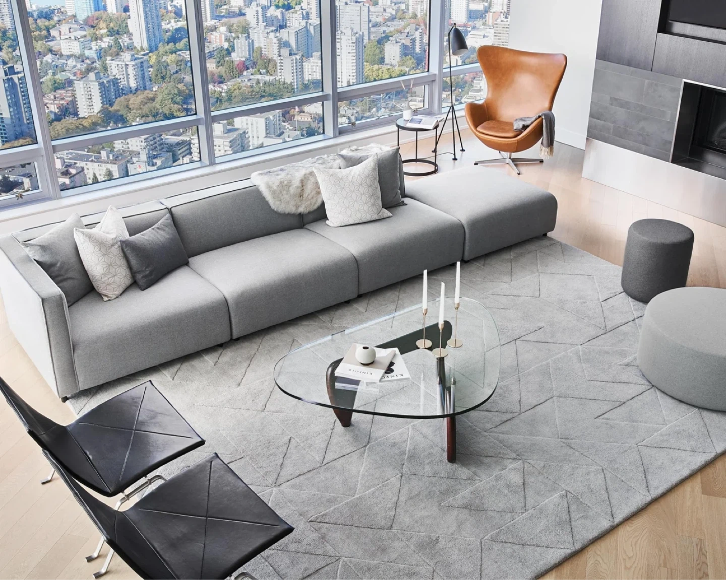 Rove Contemporary sectional sofa. Upholstered in a neutral grey fabric. Modular design allows for flexible arrangement. A comfy spot for relaxing and entertaining! Premium vegan suede.