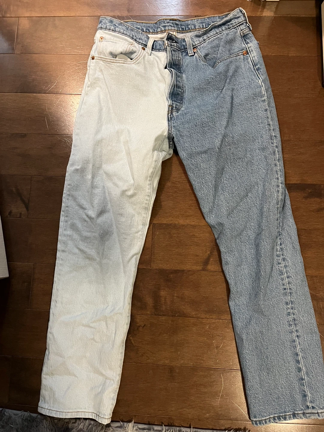 Levi's 501 jeans in a unique two-tone wash. Waist is 31 inches, inseam is 28 inches. Denim material.