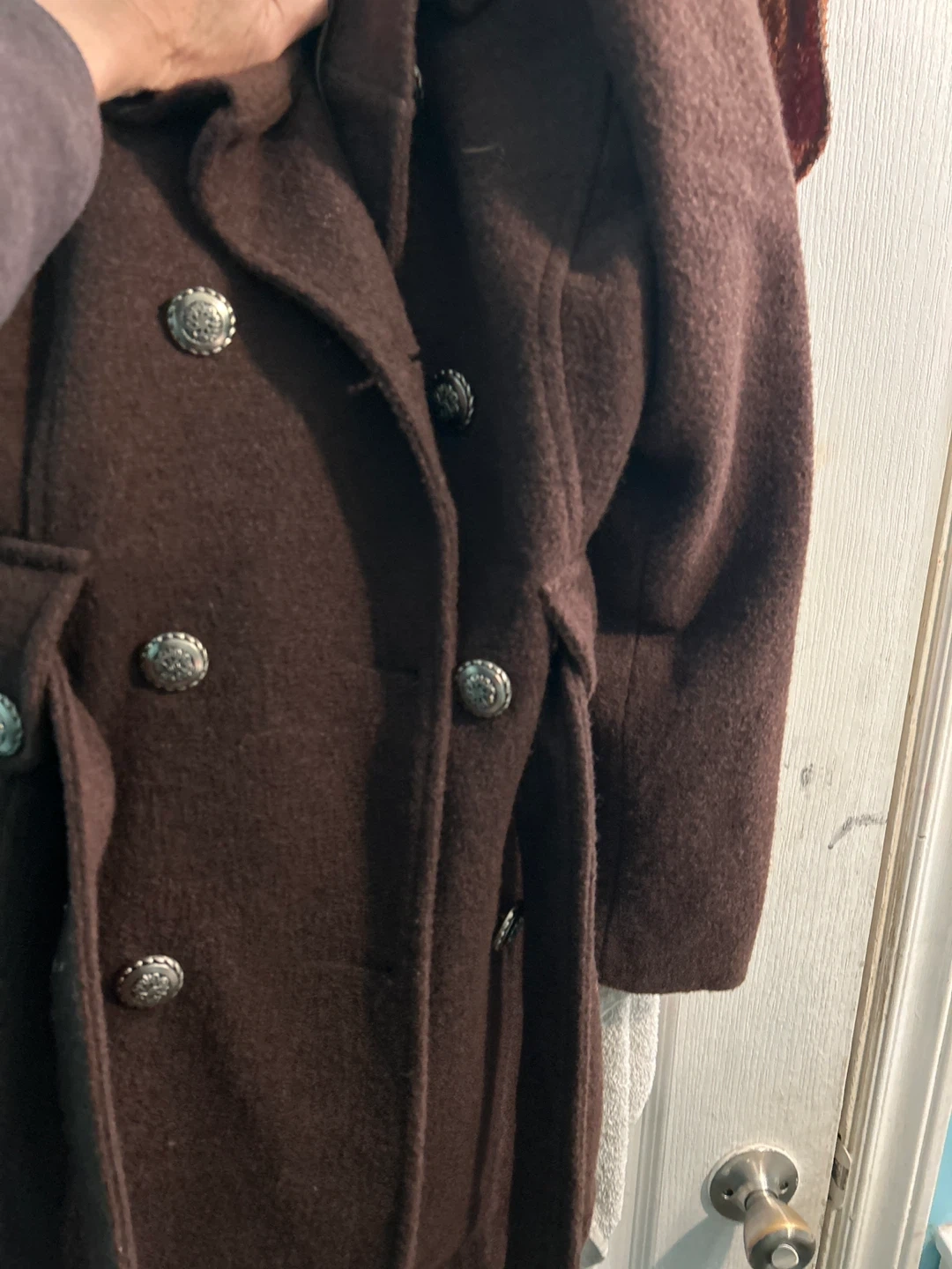 Warm brown wool coat with a double-breasted closure and decorative silver buttons. It features a tie belt at the waist for a fitted look. Cozy lined hood for extra warmth. Great for cooler weather!