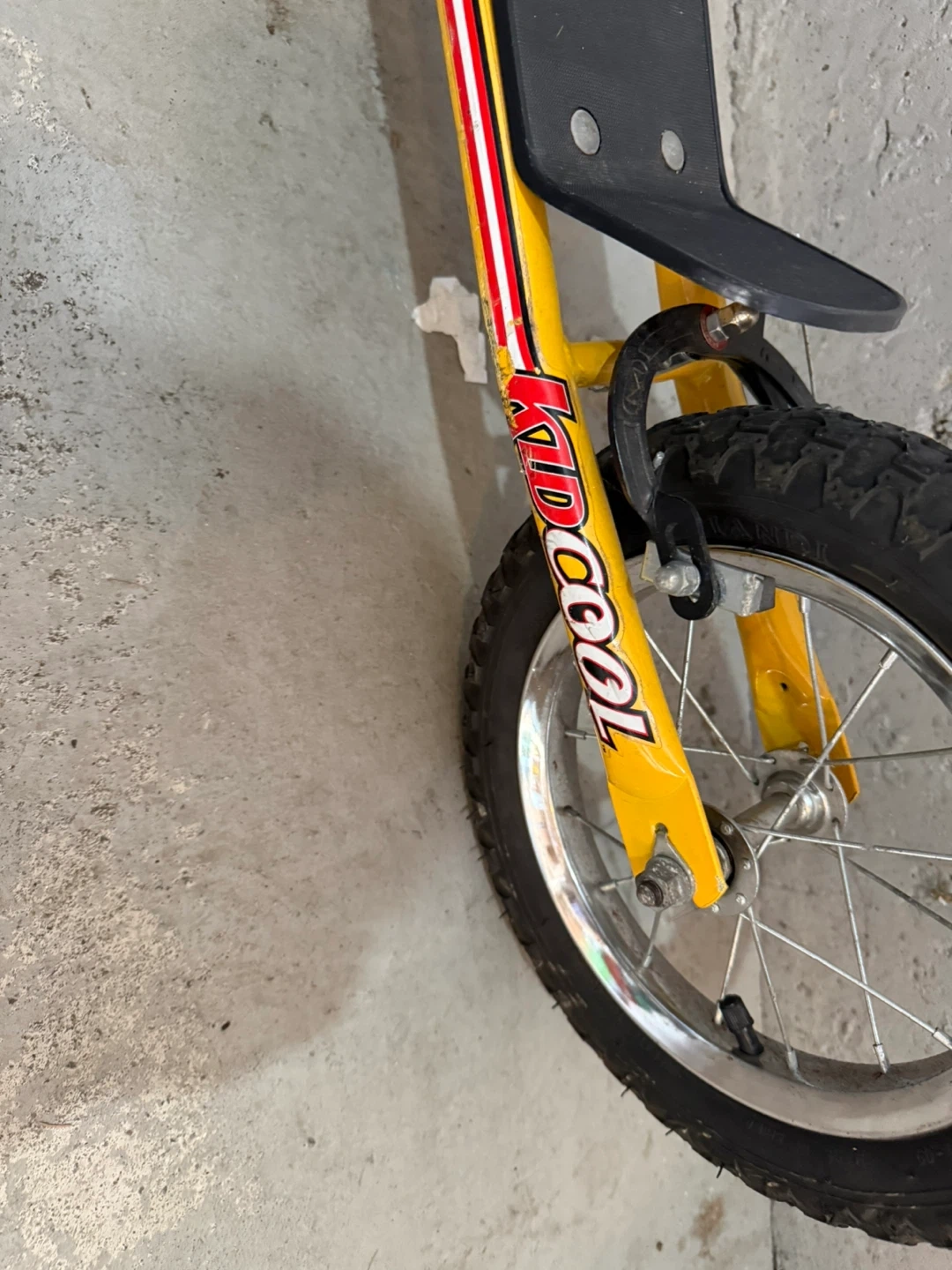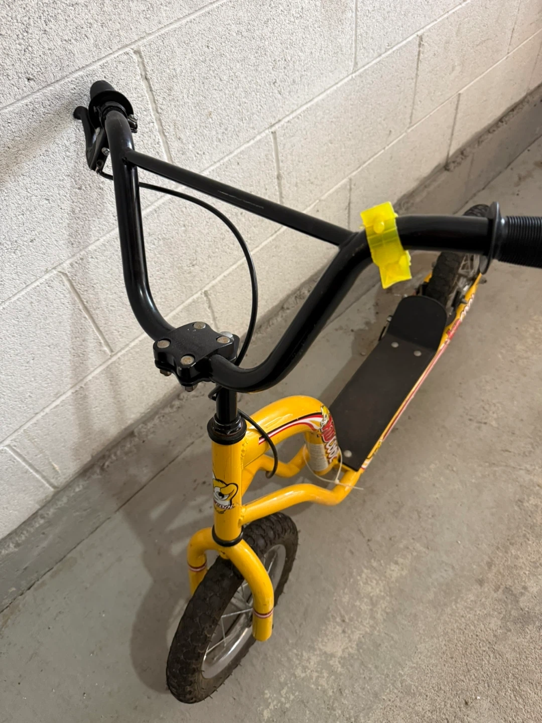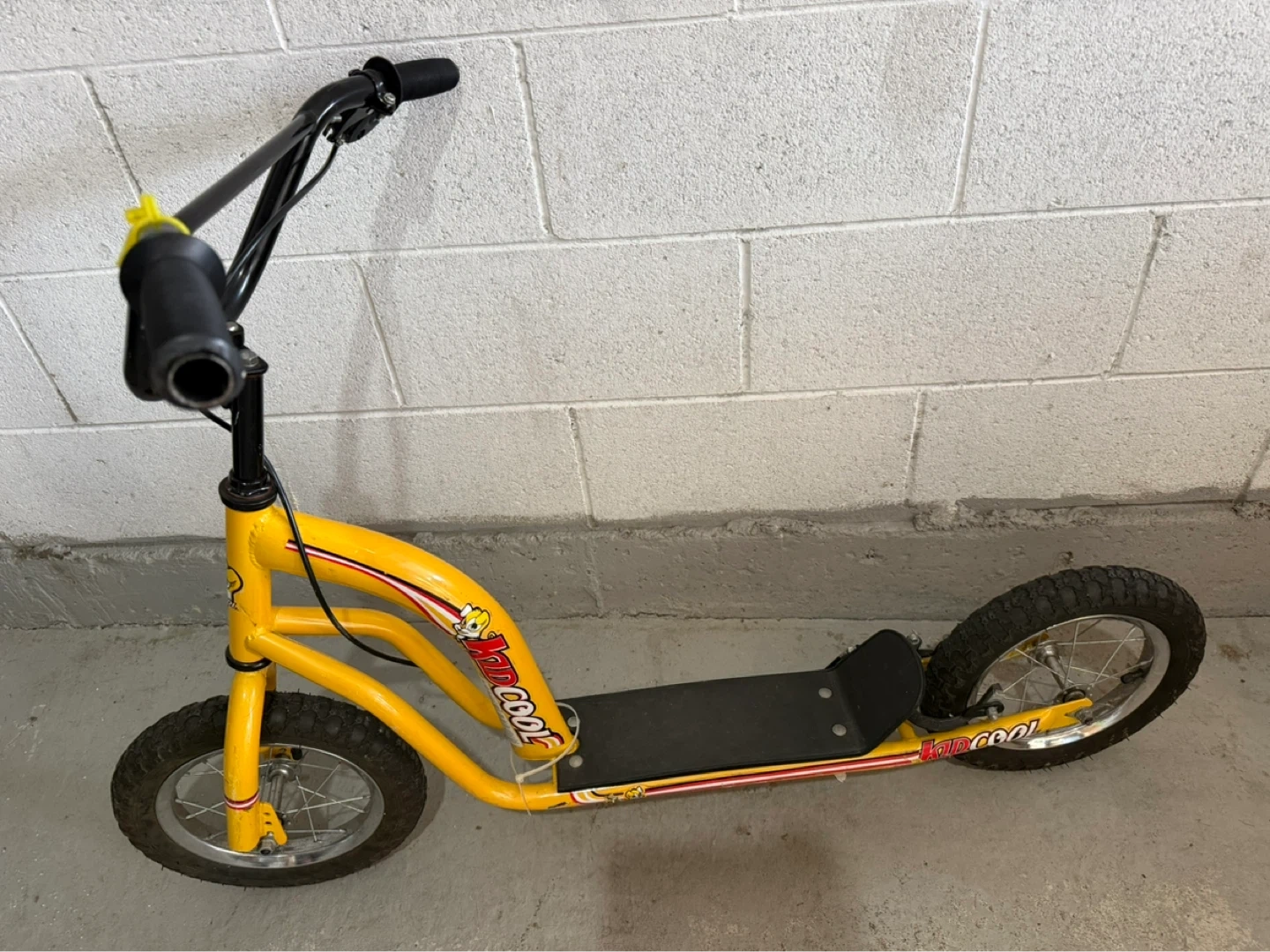 This yellow KIDZCOOL scooter features a sturdy metal frame and rugged tires. It has hand brakes for easy stopping. This scooter's design makes it fun for outdoor rides!
