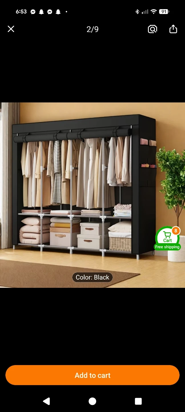 This portable wardrobe closet is a great way to organize your clothes and accessories. It features multiple shelves for folded items and hanging rods for garments. The black fabric cover keeps your items dust-free. Assembly is required.