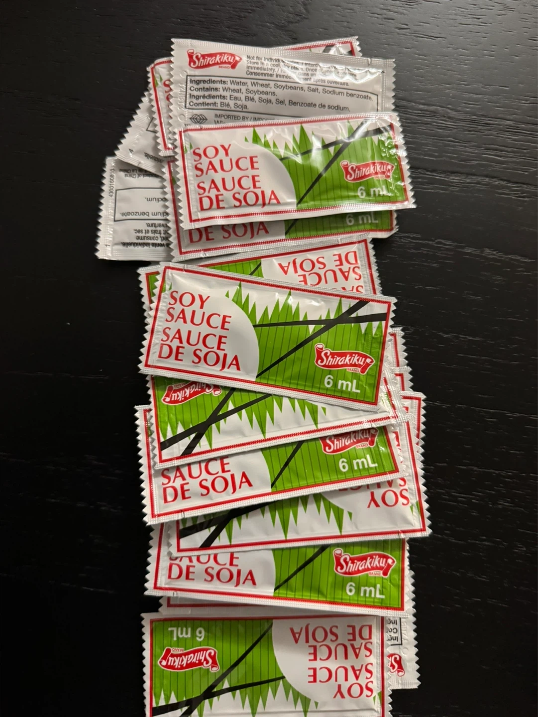 Shirakiku brand soy sauce packets. Each packet contains 6 ml. Ingredients include water, wheat, soybeans, salt, and sodium benzoate.