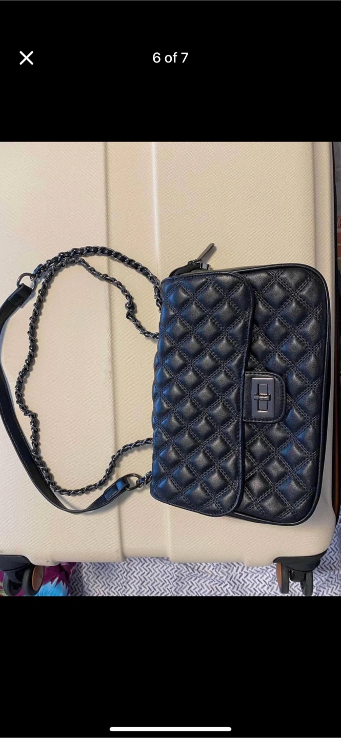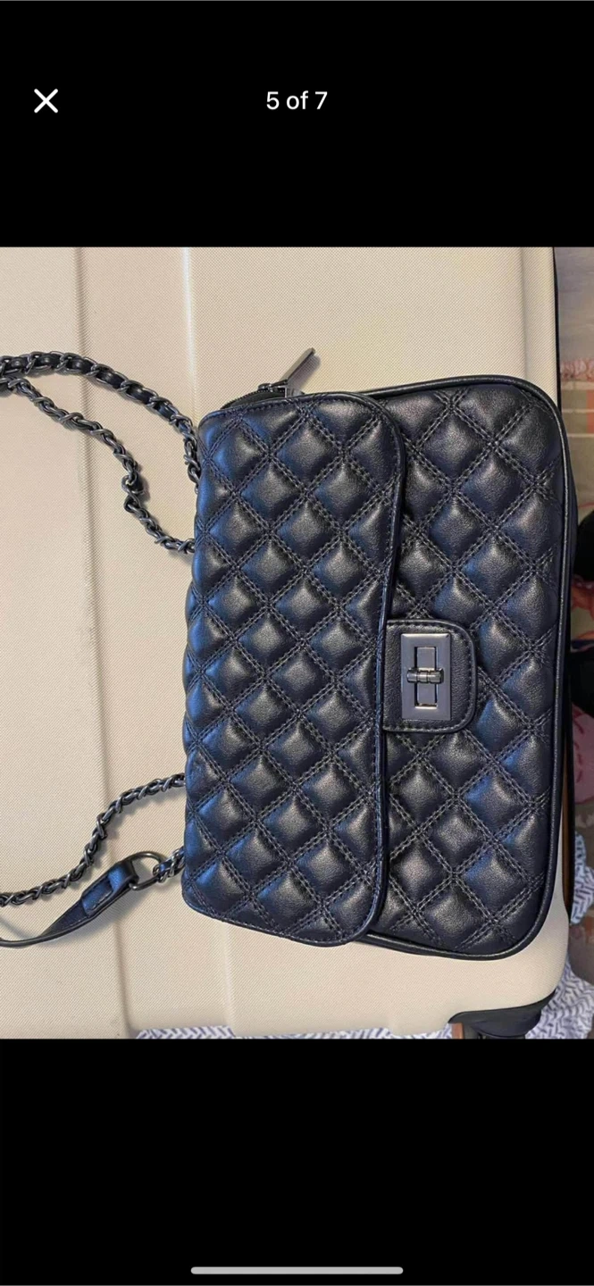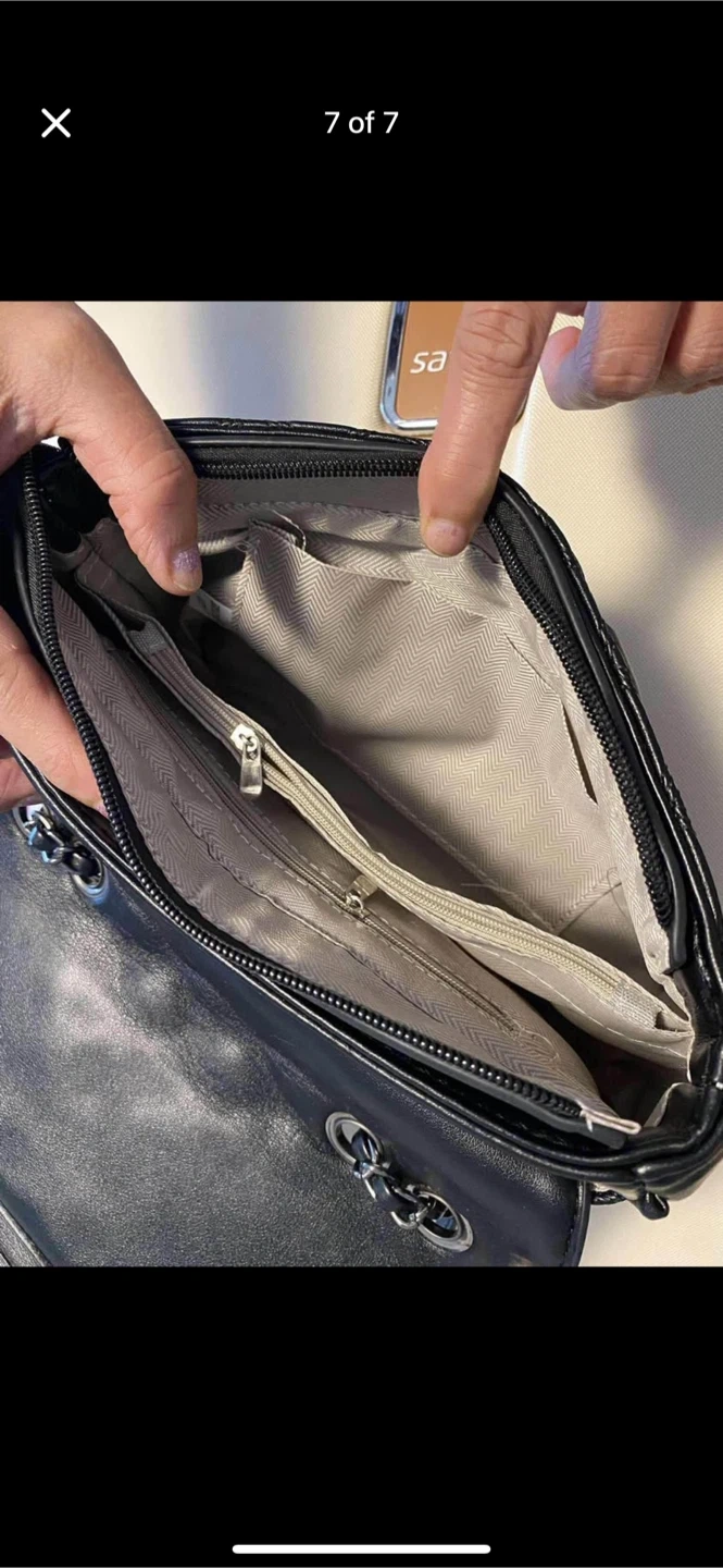 It has a cool chain strap and a turn-lock closure. Inside has multiple compartments and zipper pockets, super handy for keeping things organized.