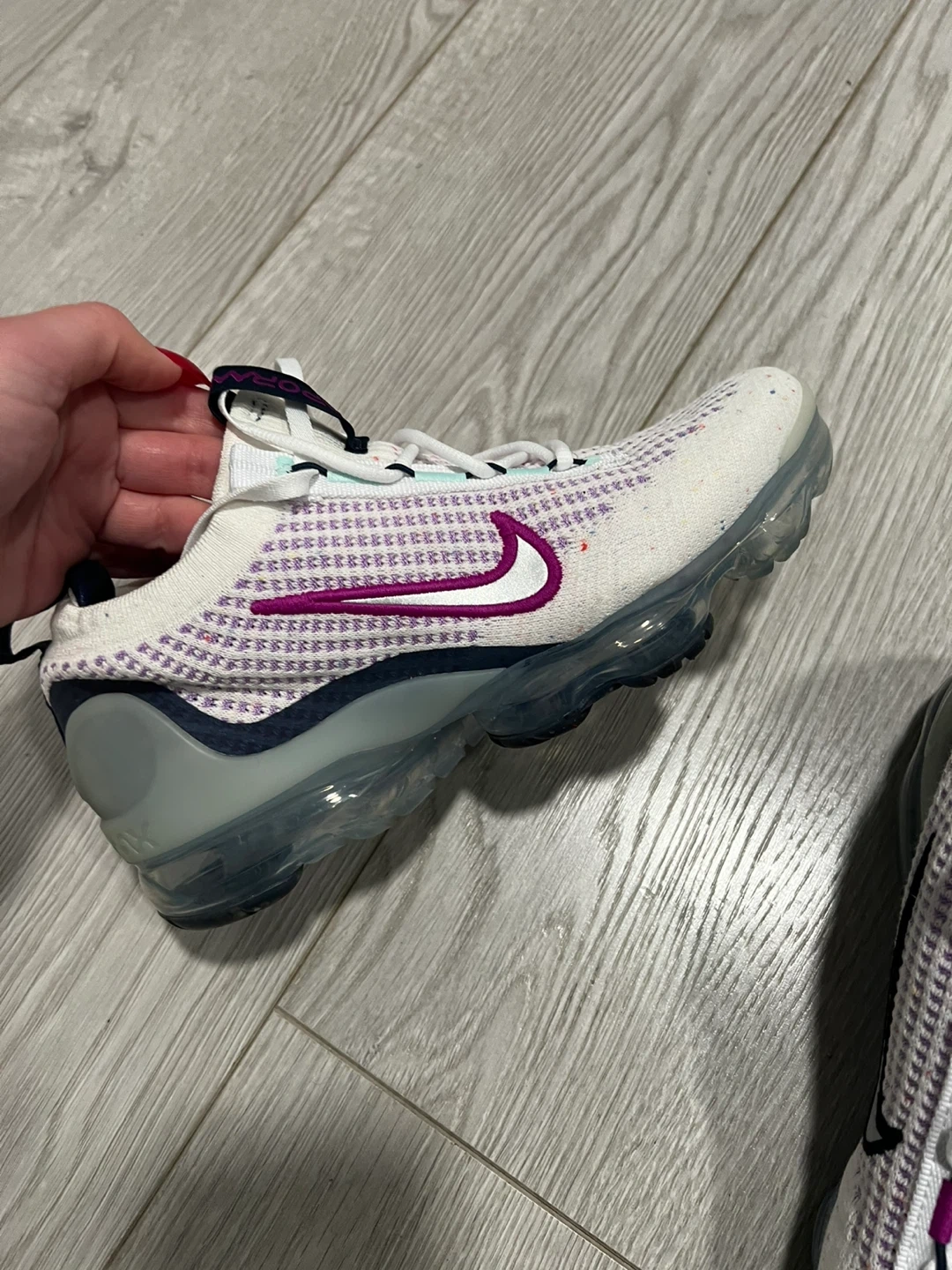 Here's a pair of Nike Air Vapormax 2023 Flyknit women's sneakers. They feature a white and purple colourway and the signature Vapormax sole. Great for running or everyday wear!