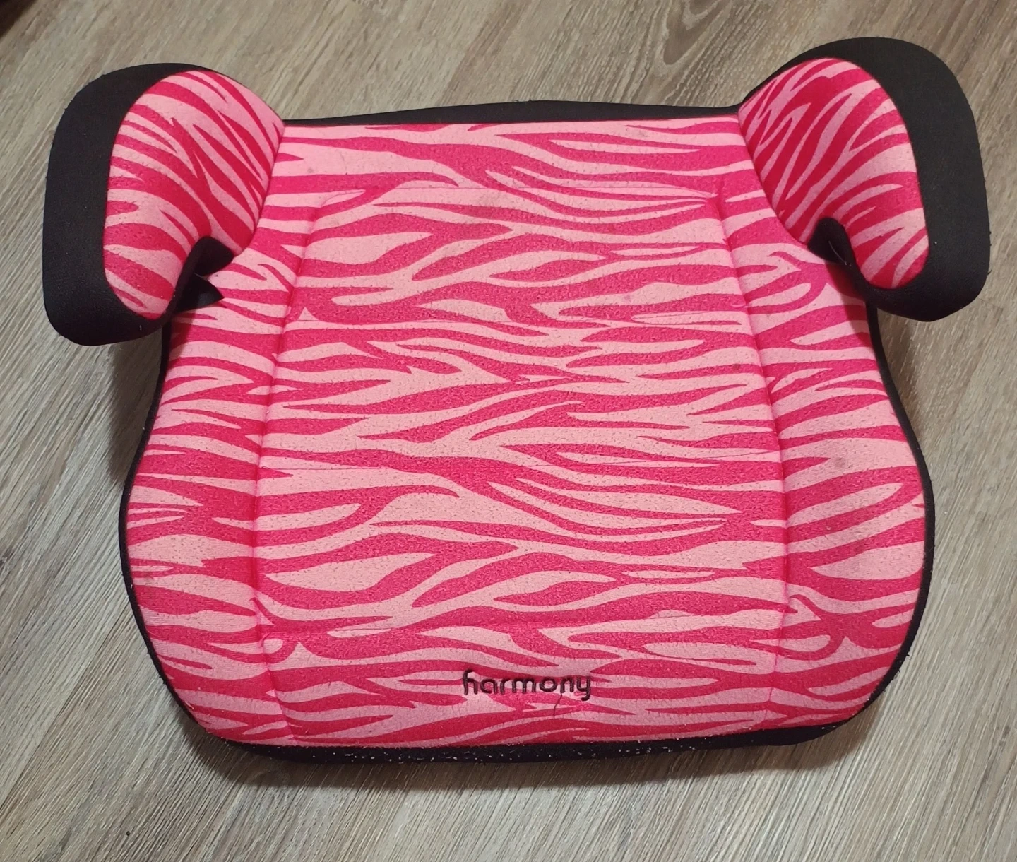 Pink zebra print booster car seat by Harmony. It's a comfortable and safe option for your child's travel needs. Padded headrest for extra support.