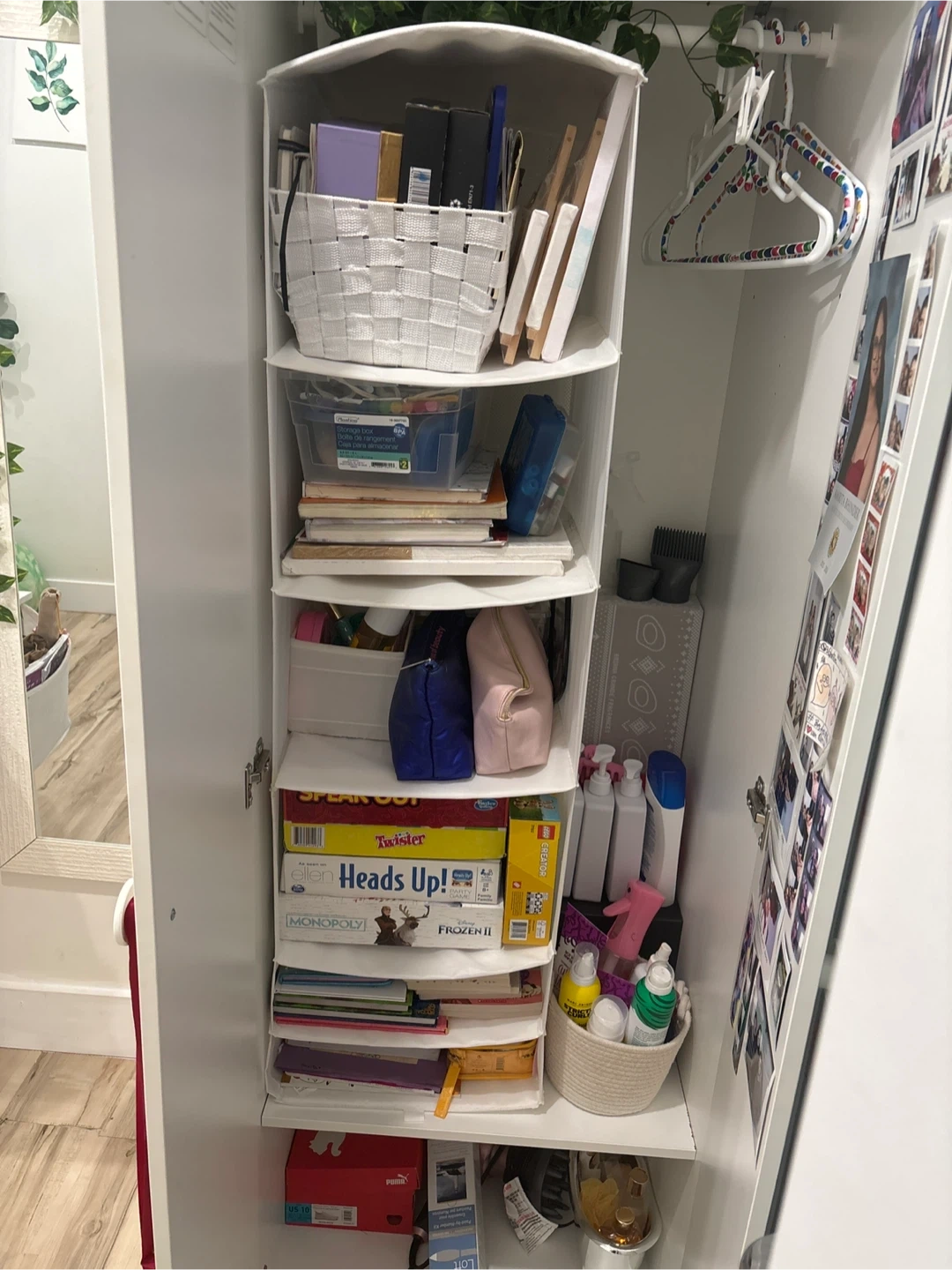 This white two-door storage cabinet offers ample vertical space for organization. It features multiple shelves and compartments for storing various items. Inside, you'll find a hanging organizer with fabric shelves. Inside organizers for free!