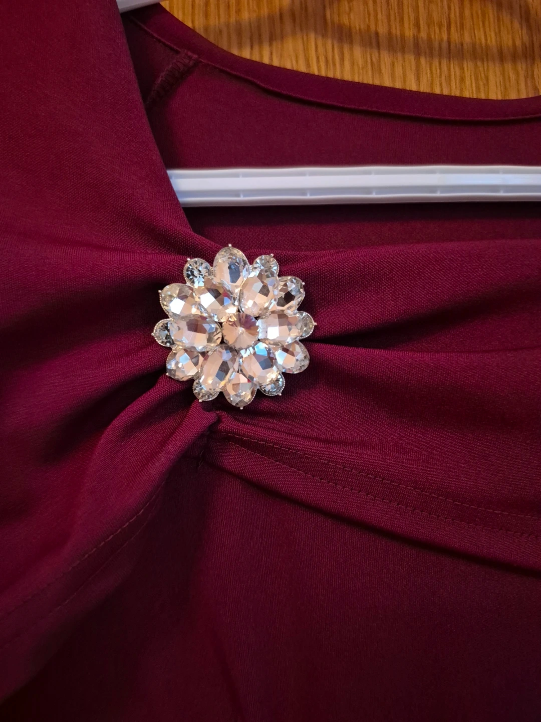 Selling a lovely burgundy dress. It's a size small and made of 100% polyester. The dress features a decorative brooch detail at the neckline.