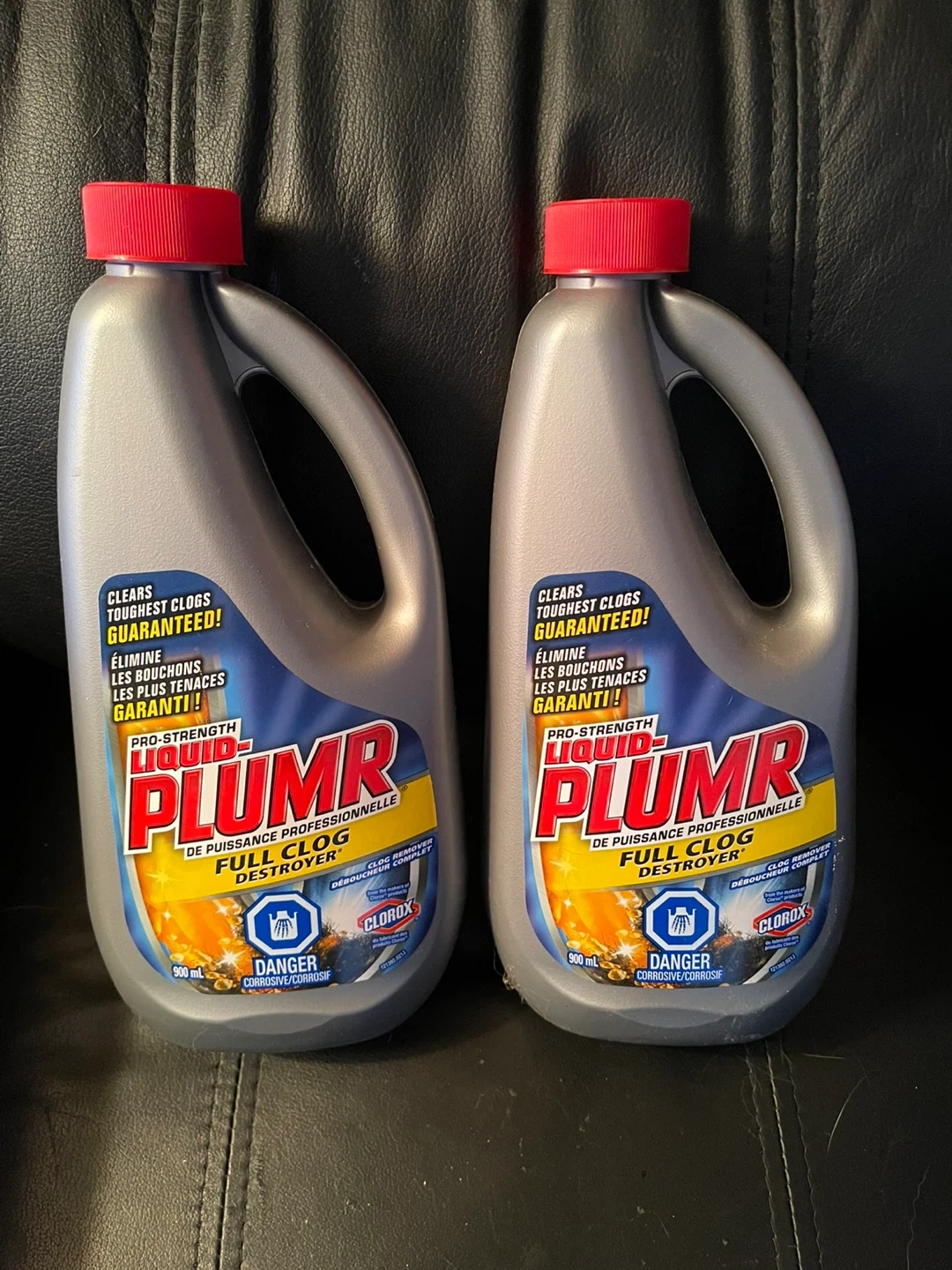 Pro-strength Liquid-Plumr Full Clog Destroyer. Clears the toughest clogs guaranteed! One bottle is brand new and contains 900 ml. The other bottle is half full. Each treatment requires half a bottle so this amounts to three treatments. Use for disposal and drain clogs.