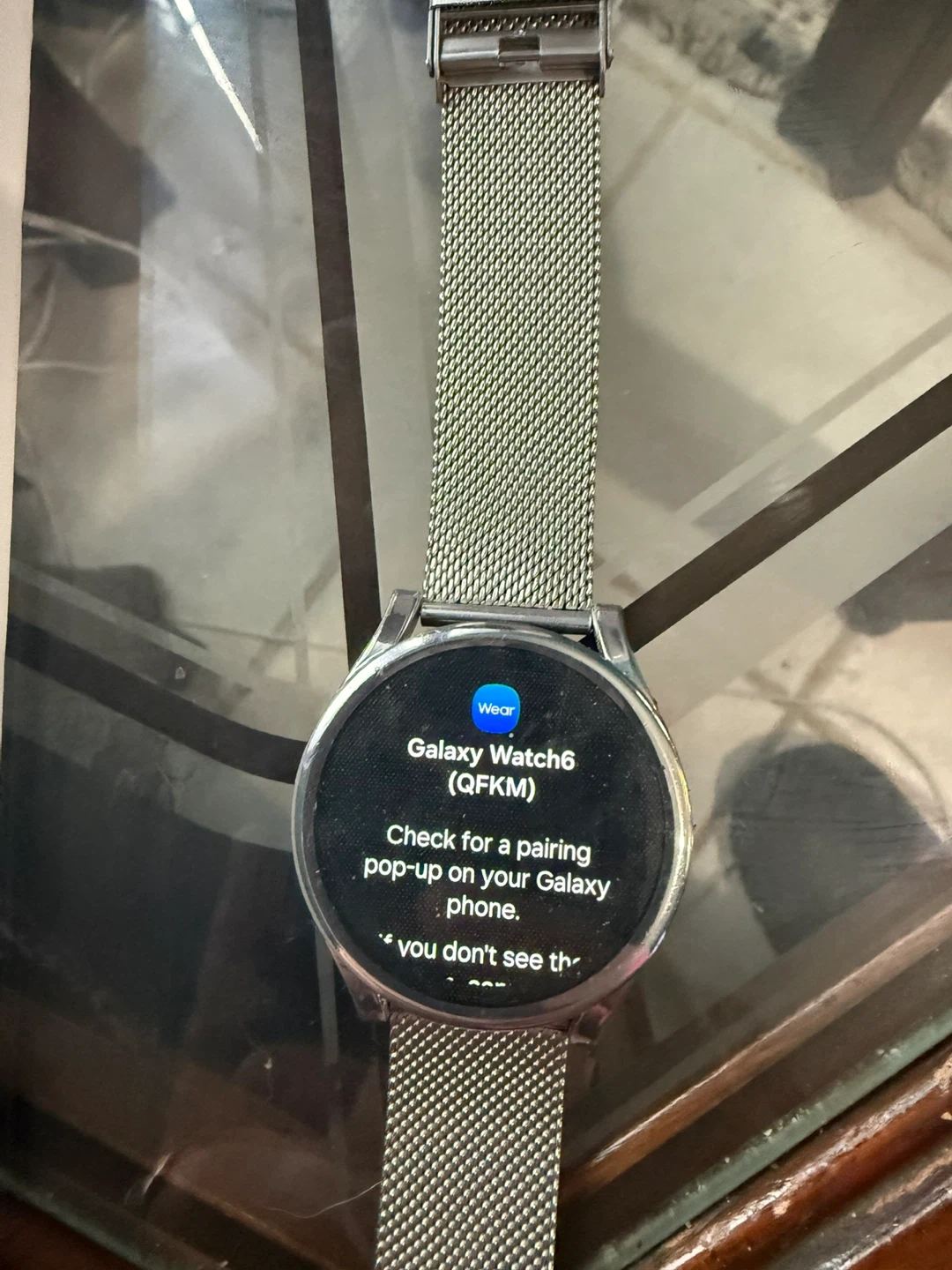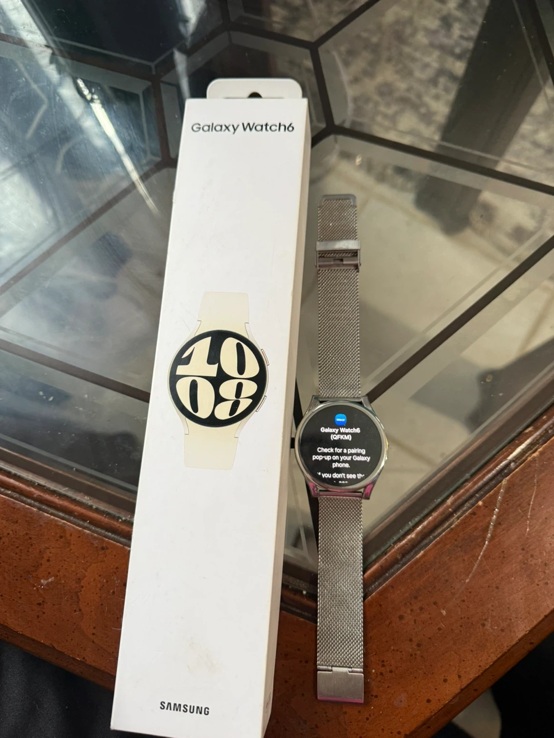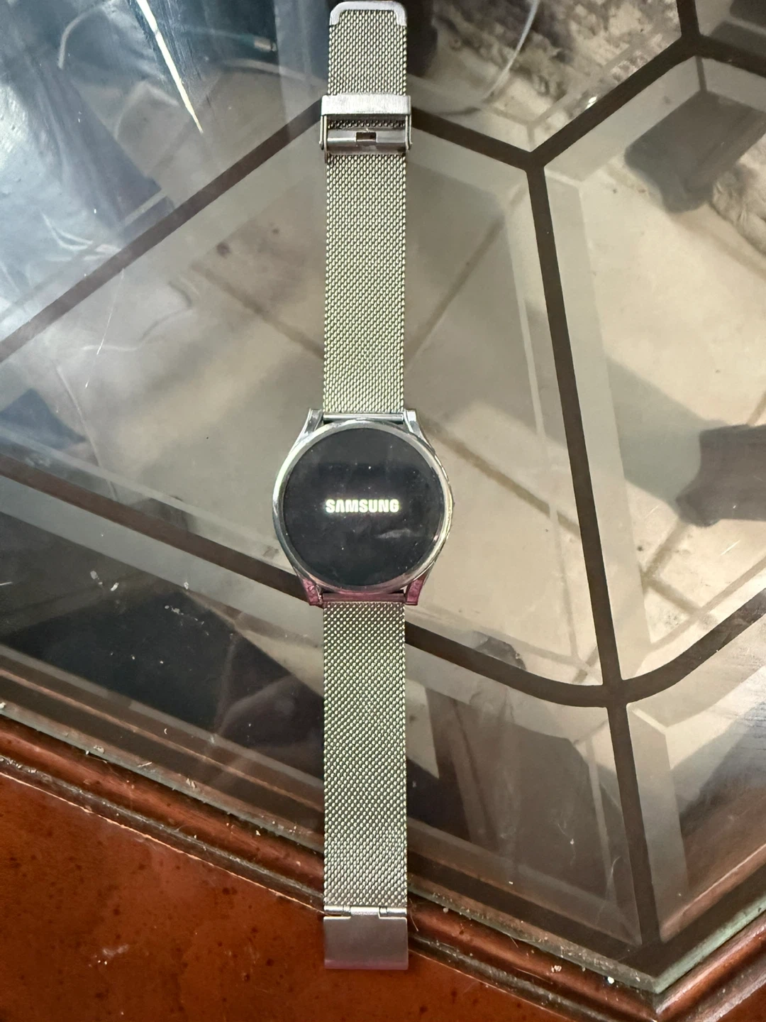 Samsung Galaxy Watch6 smartwatch with a sleek silver Milanese band. It's ready for pairing with your Galaxy phone. This watch offers advanced features for health and connectivity. It’s in good working condition and comes with a cover for the screen, the band, original box, and charger!