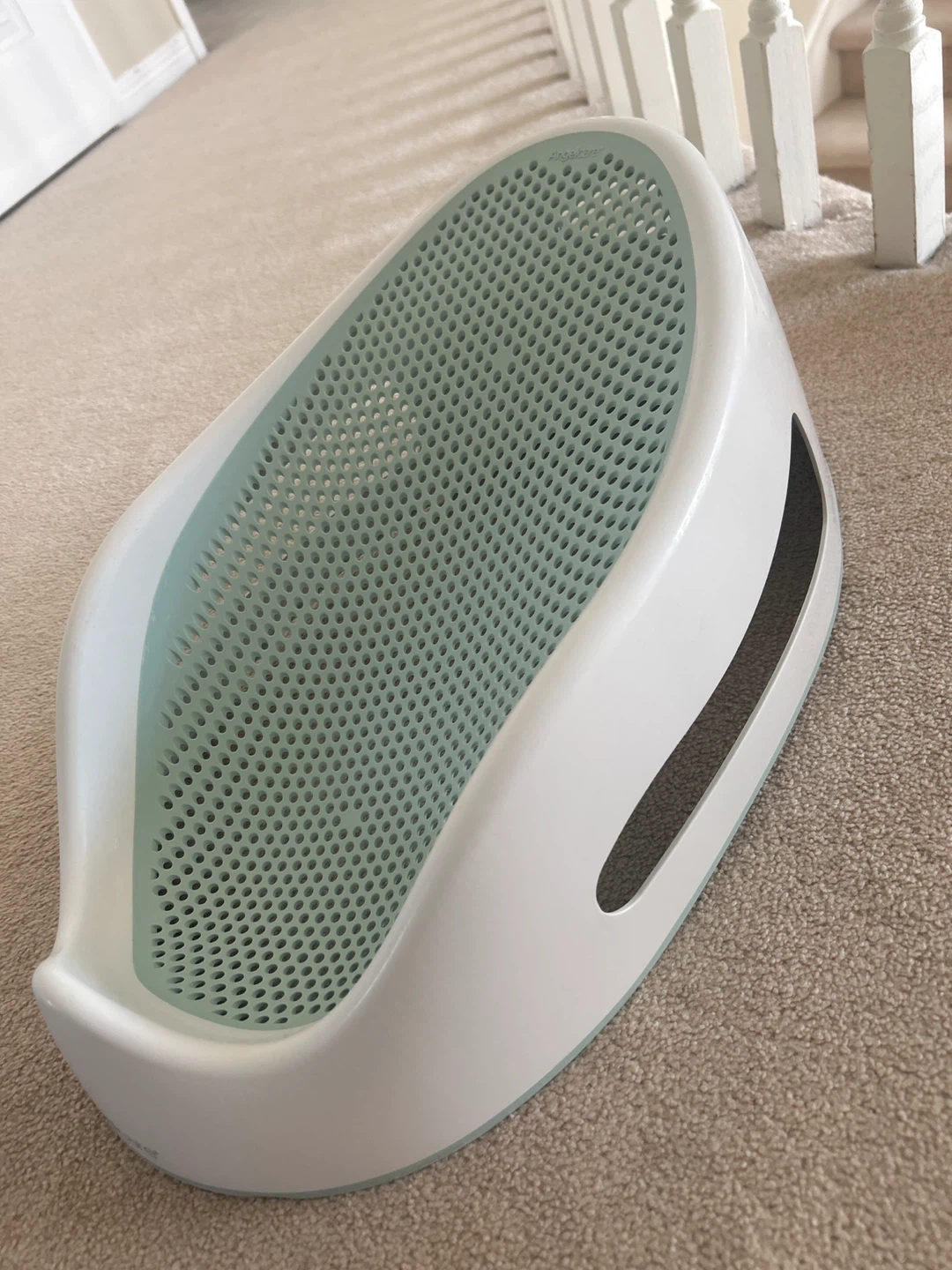 Angelcare baby bath support seat in white and light blue. It's made from durable plastic with a non-slip surface and drainage holes. Designed for use in the tub to help keep baby secure during bath time.