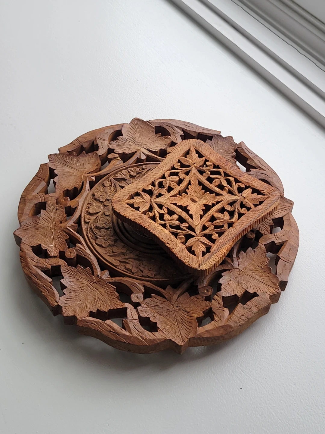 Vintage Hand Carved Wood Trivet & Coasters. Boho India. Plants
