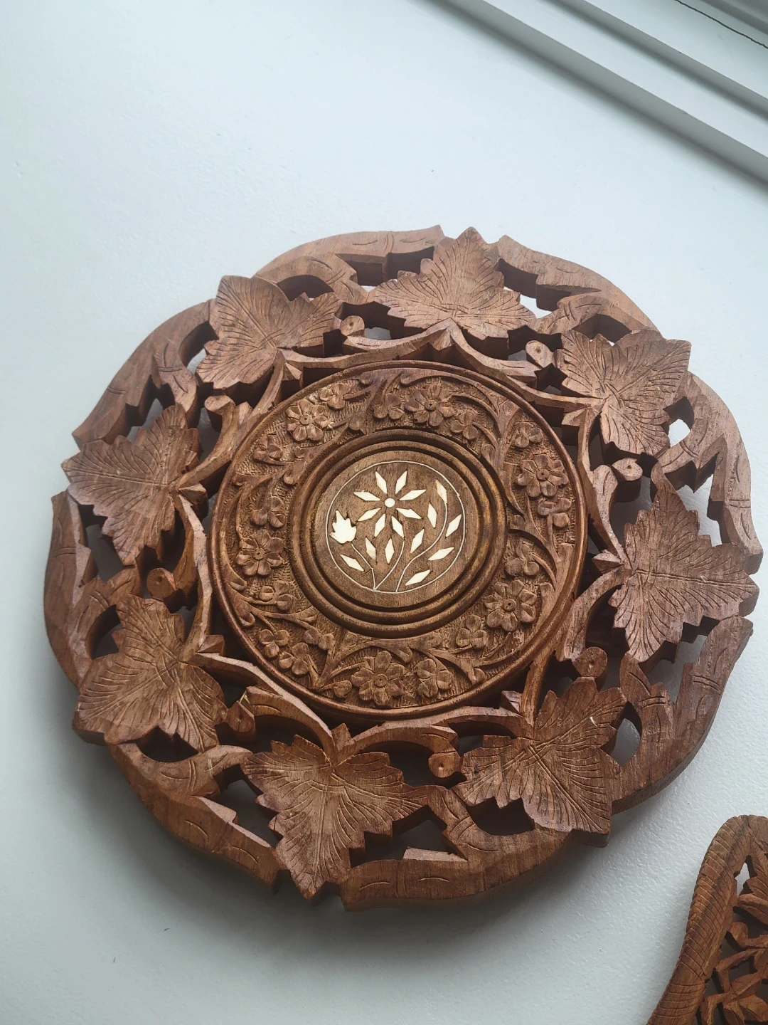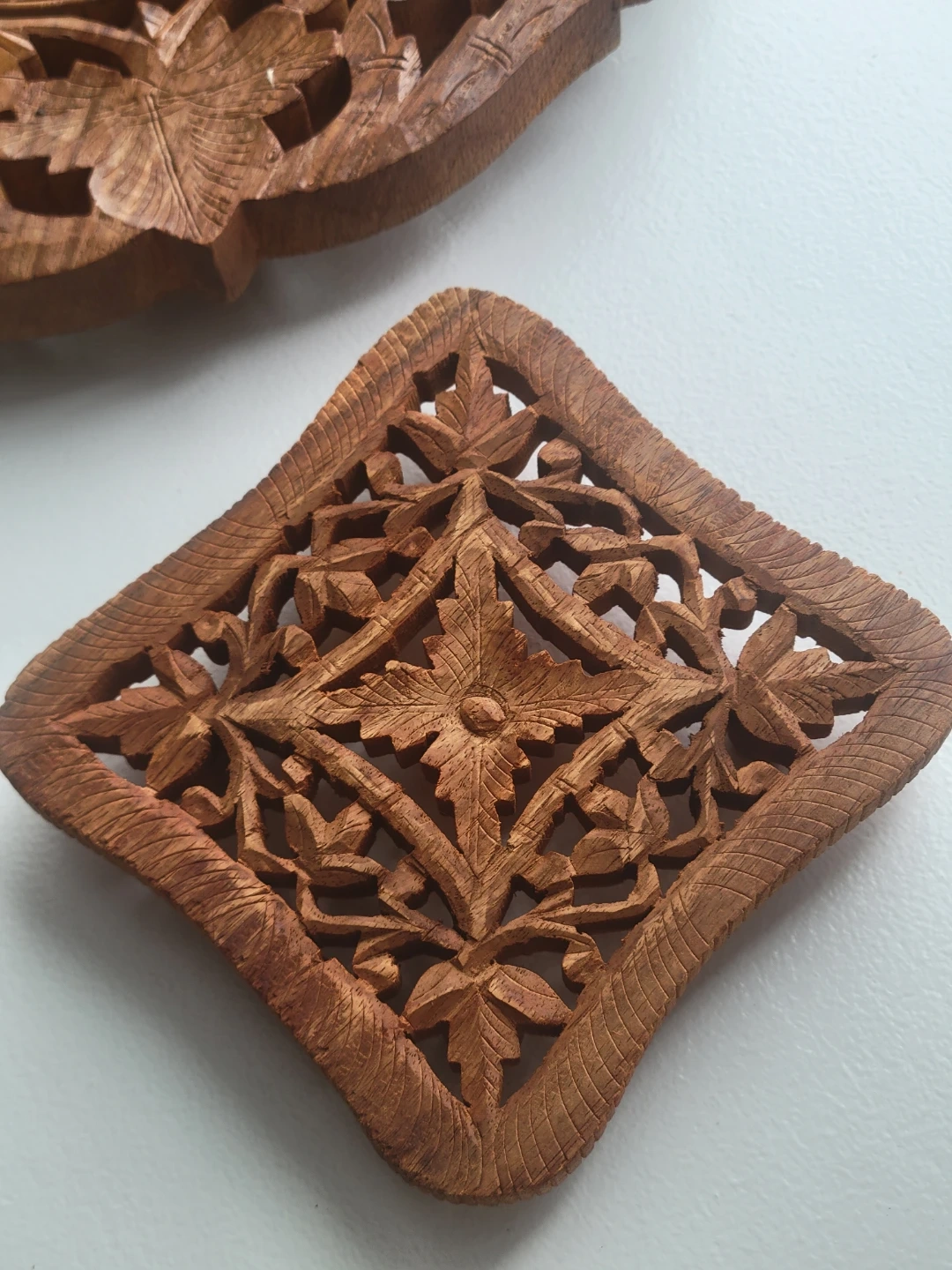 These vintage hand-carved wood trivets from India feature intricate floral and leaf designs, perfect for adding a touch of rustic charm to your home as plant coasters or decorative accents. one round trivet and one square trivet, showcasing detailed craftsmanship.