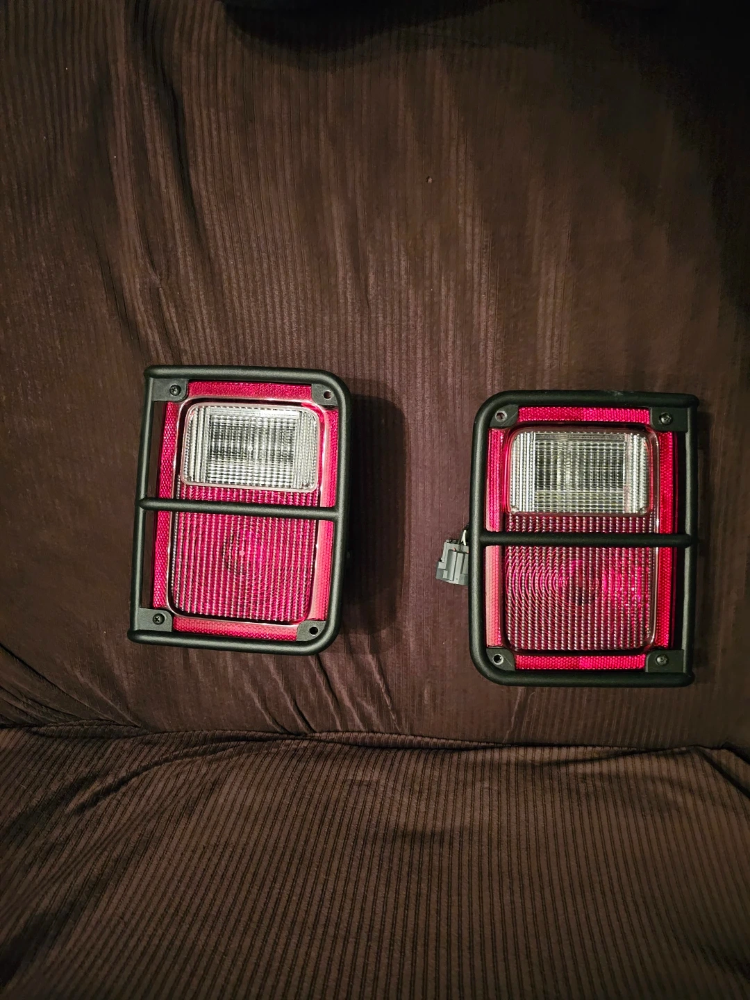 Selling a pair of tail lights for a 2018 Jeep Wrangler Unlimited Sahara. These are the rear lights for the vehicle. They come with the protective grilles. They're made of durable plastic.