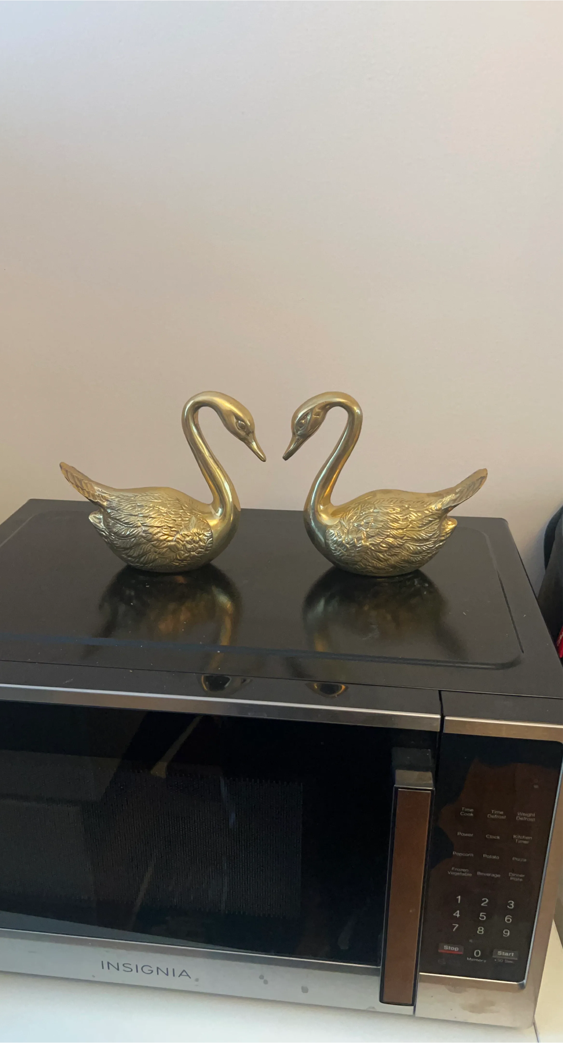 A charming pair of brass swan figurines, perfect for adding a touch of elegance to your home decor. These decorative pieces showcase intricate detailing and a classic design. They're ideal for display on shelves, mantels, or as a centrepiece. Brand new