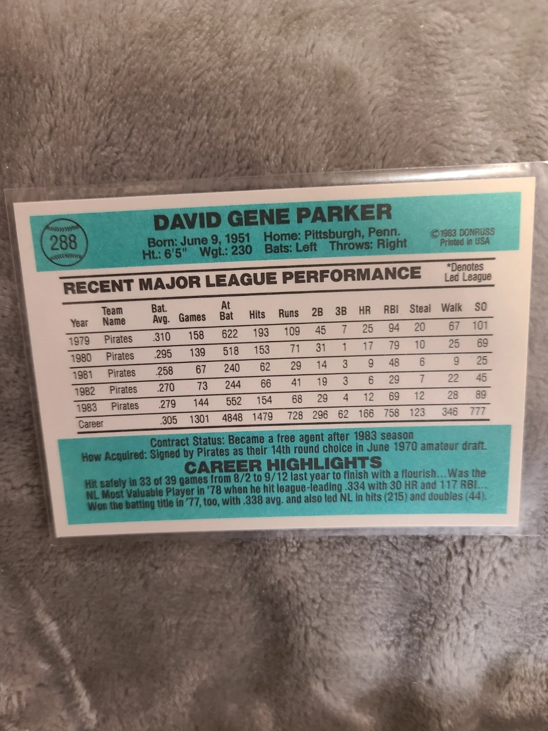 This is a 1984 Donruss baseball card featuring Dave Parker of the Pittsburgh Pirates. It includes his career highlights and recent major league performance statistics. Born June 9, 1951.