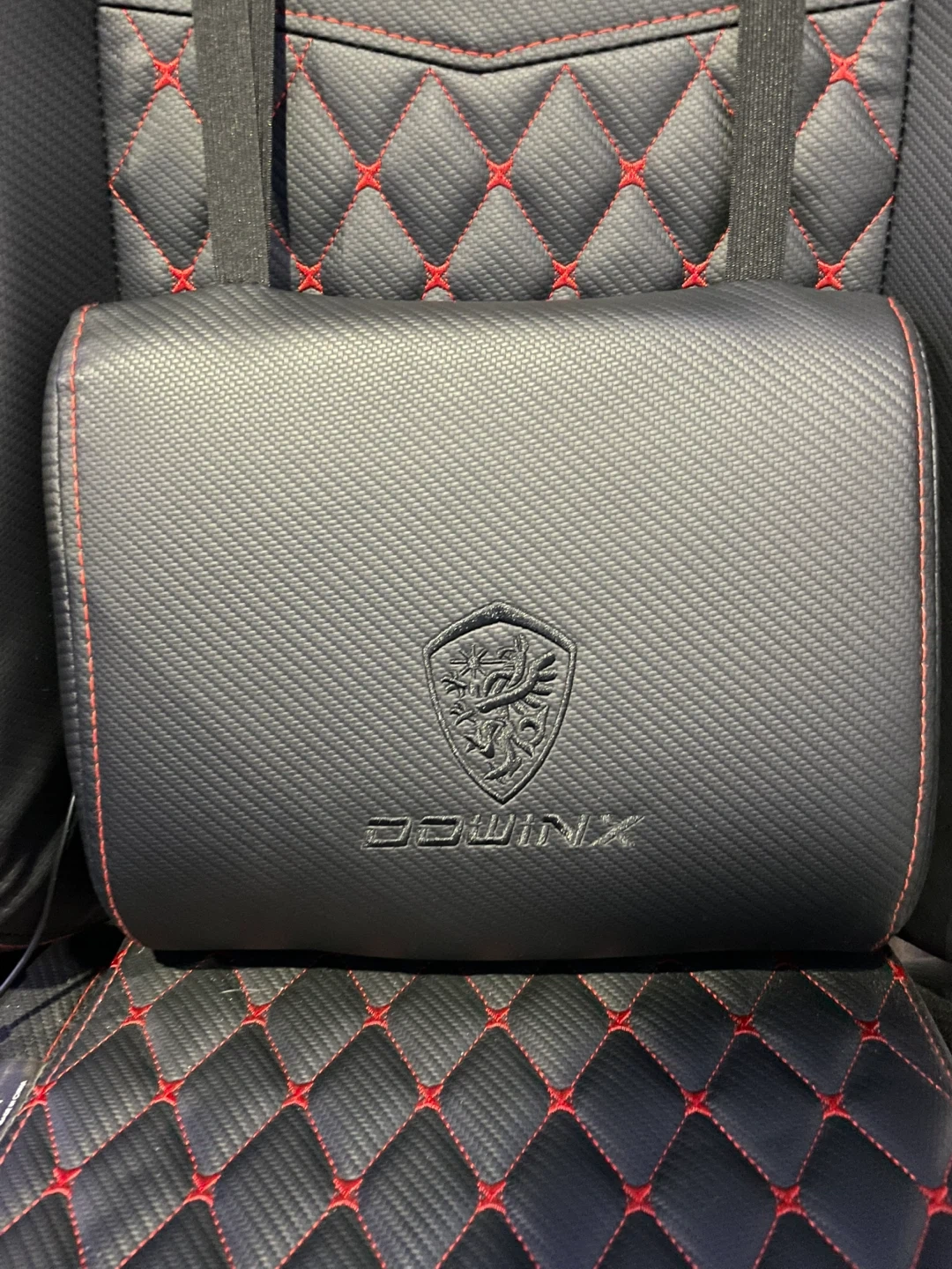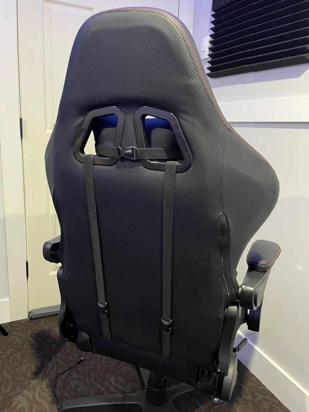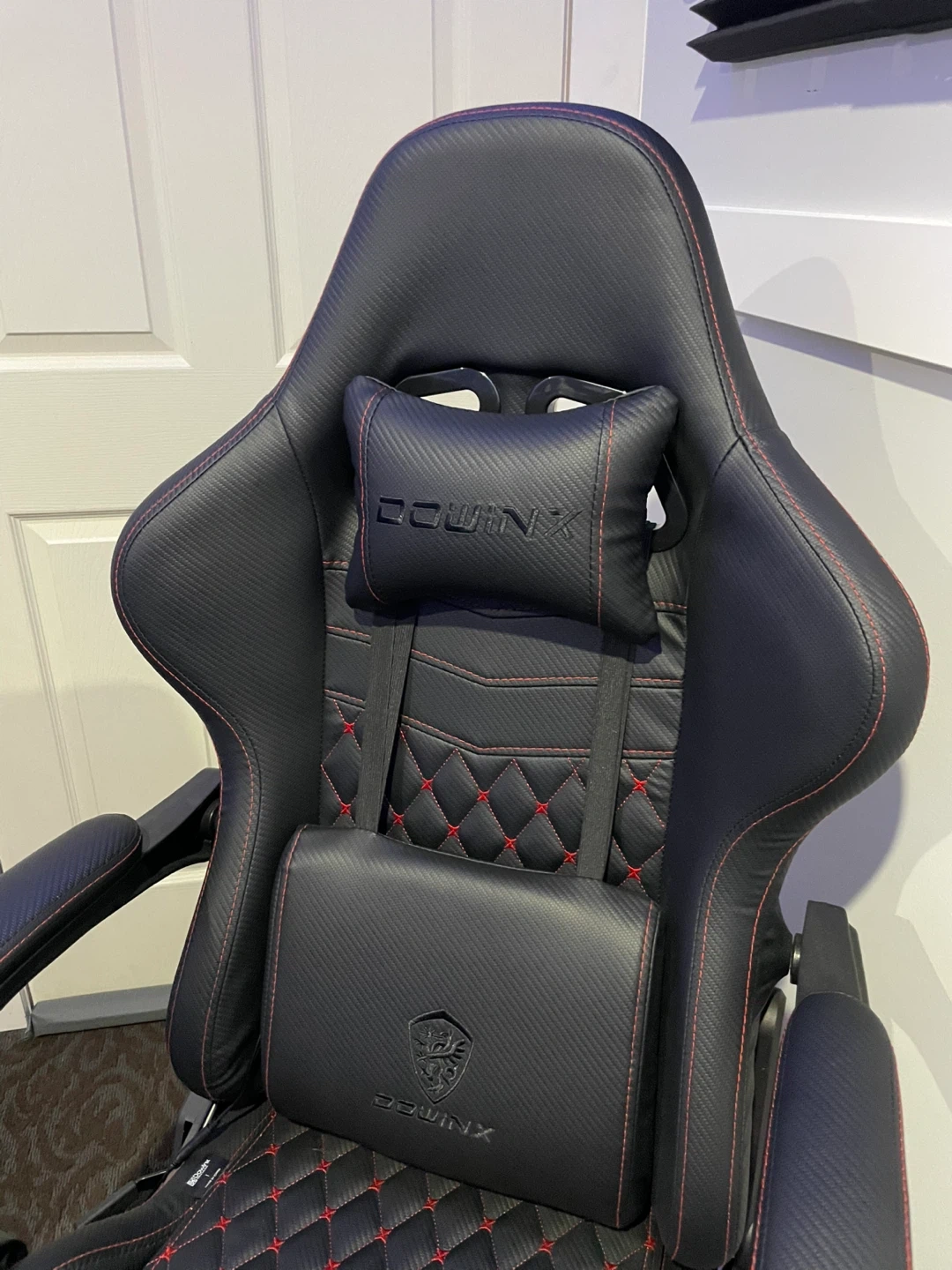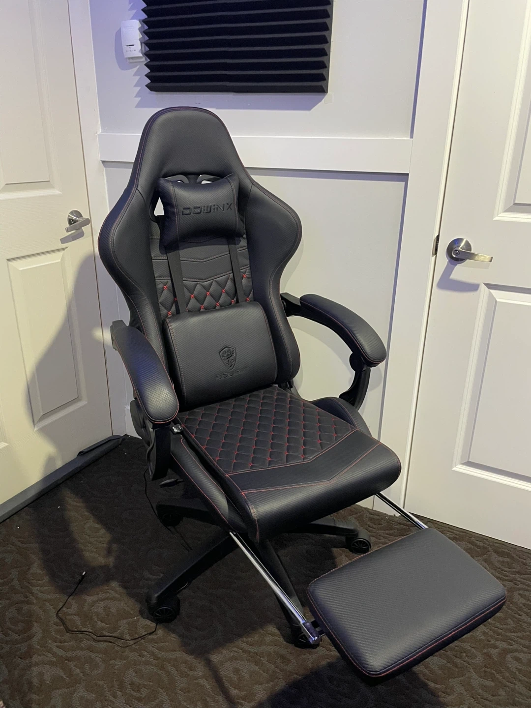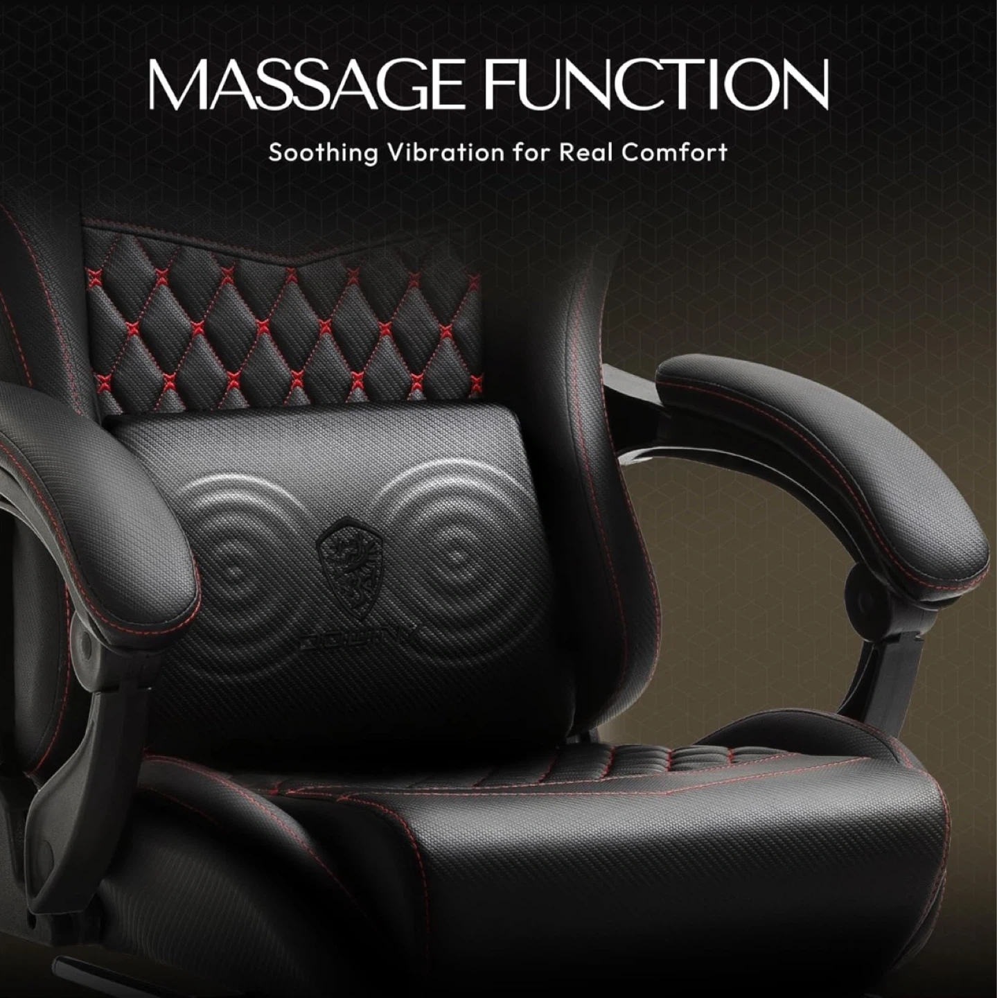 This gaming chair is upholstered in black faux leather with stitching. It features adjustable lumbar support and a retractable footrest for added comfort, as well as a massaging function and a head pillow for support. Brand new, only tested once at a desk. Originally bought for $300.