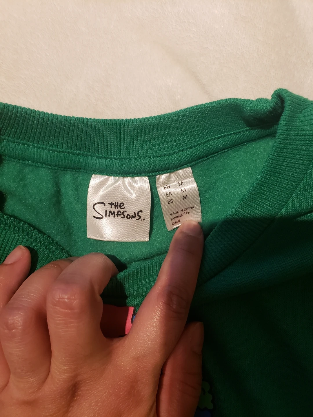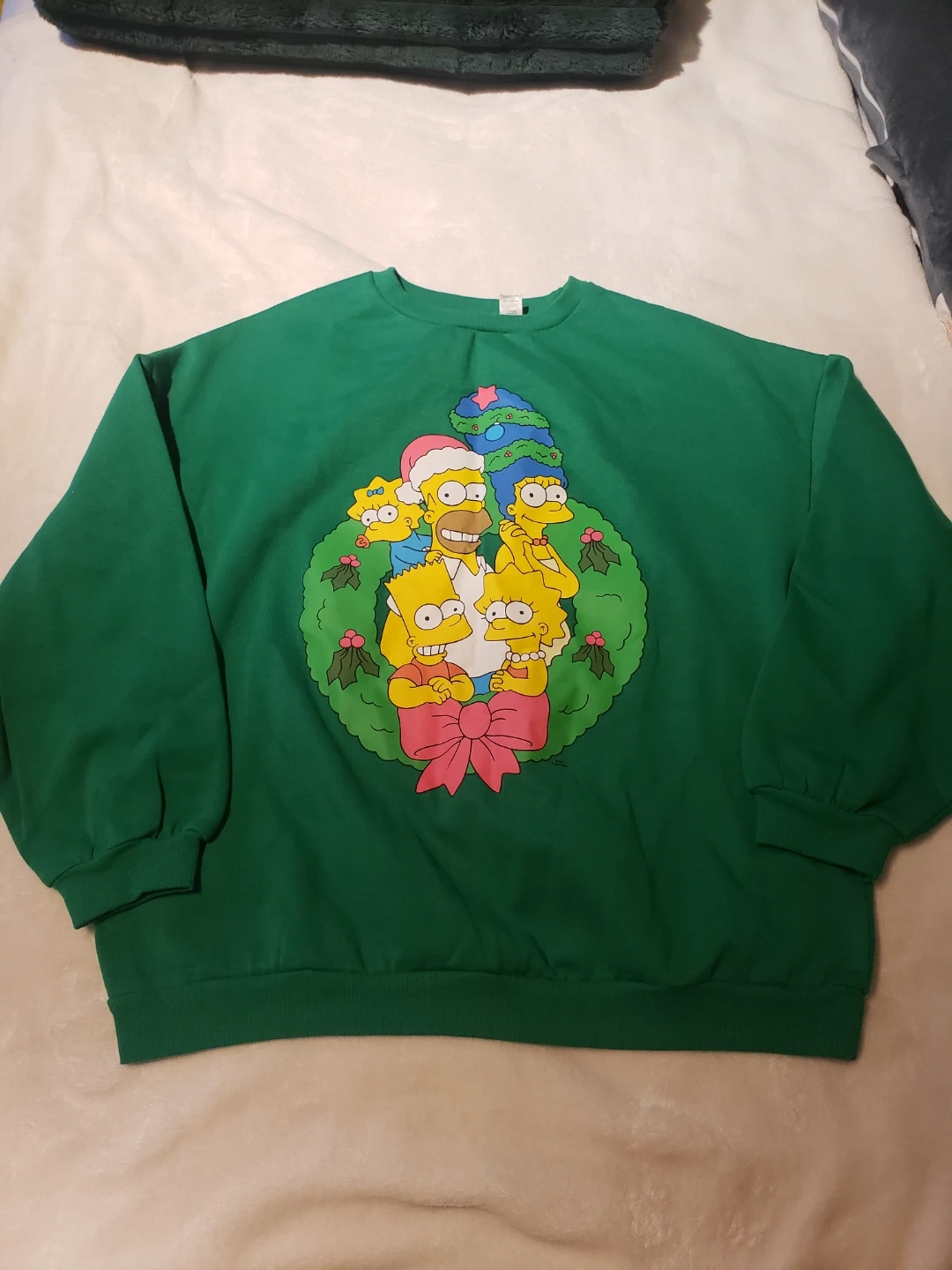 Green crewneck sweatshirt featuring The Simpsons family in a festive wreath design. It's a size medium. This cozy sweater is great for holiday gatherings! Never worn before.