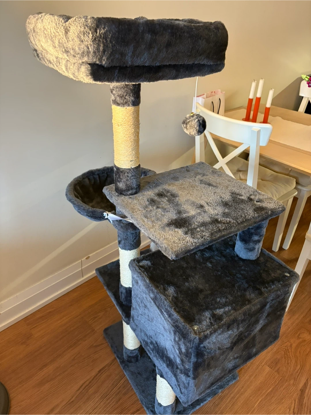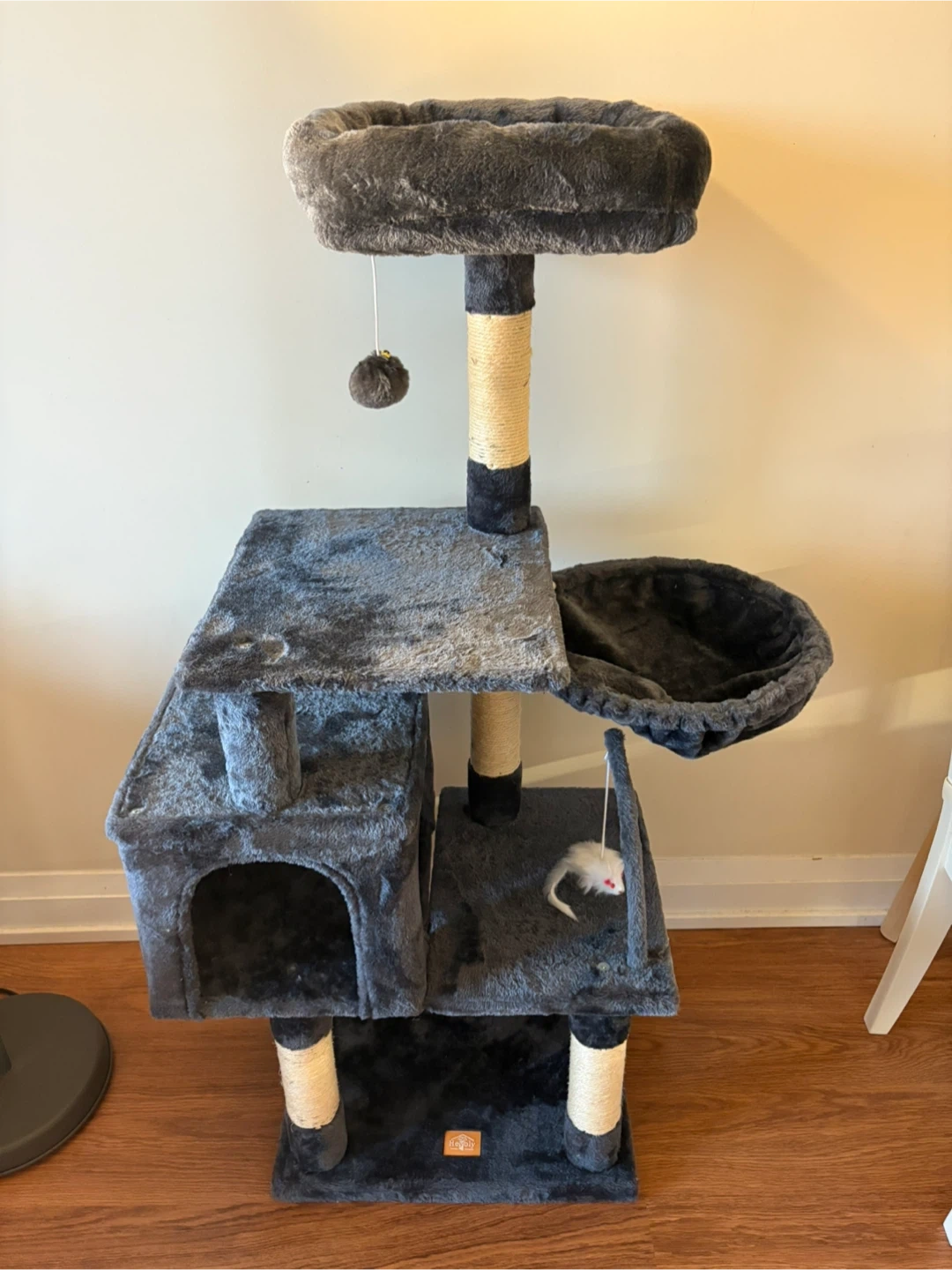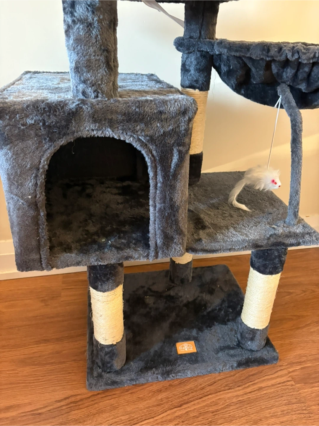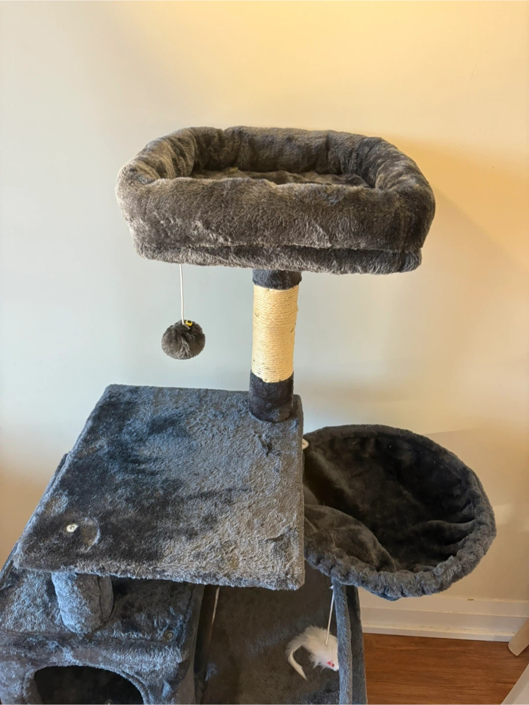 Grey Cat Tree with Condo and Dangling Toys