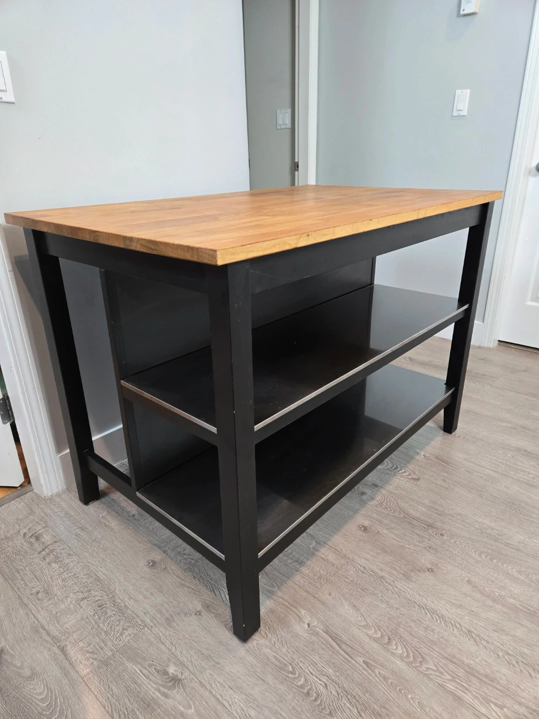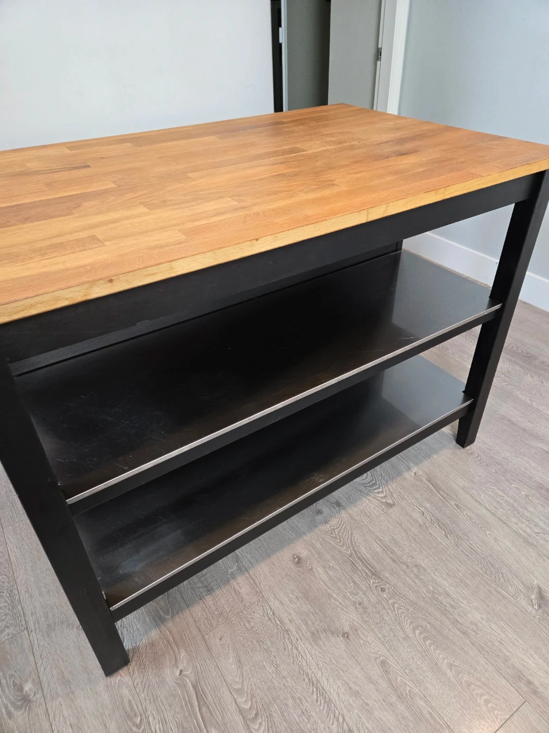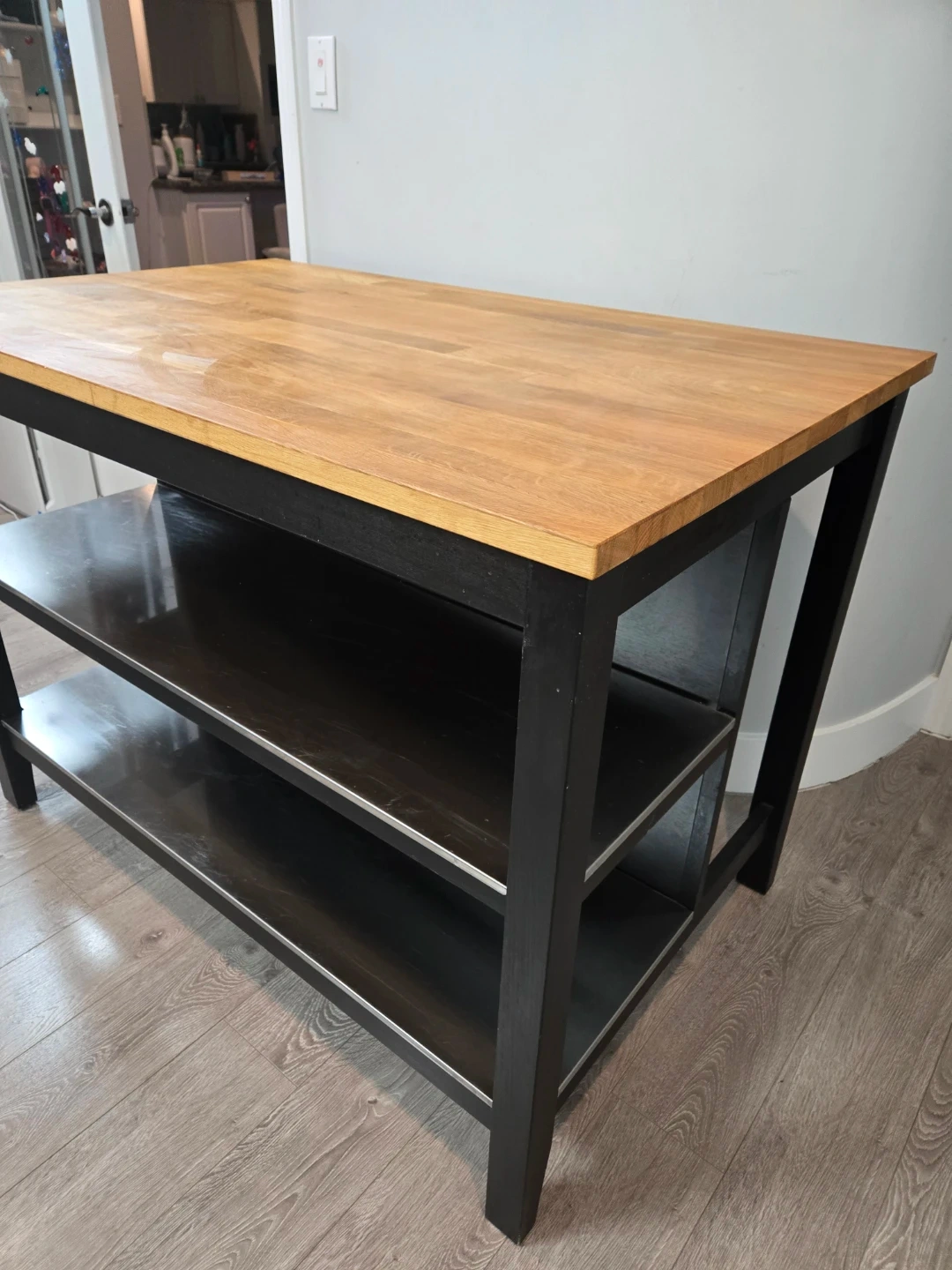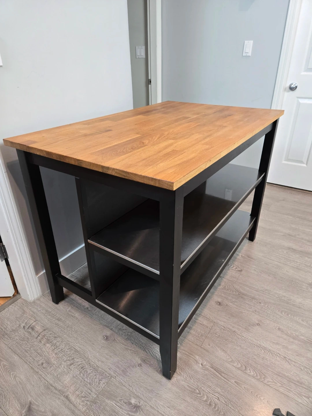 Newly refinished large stenstorp kitchen island with butcher block.