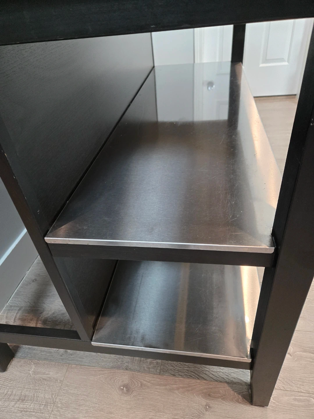 The stainless steel shelves have minor scratches on it. A stainless steel cleaner was used to sanitize and buff the shelves.