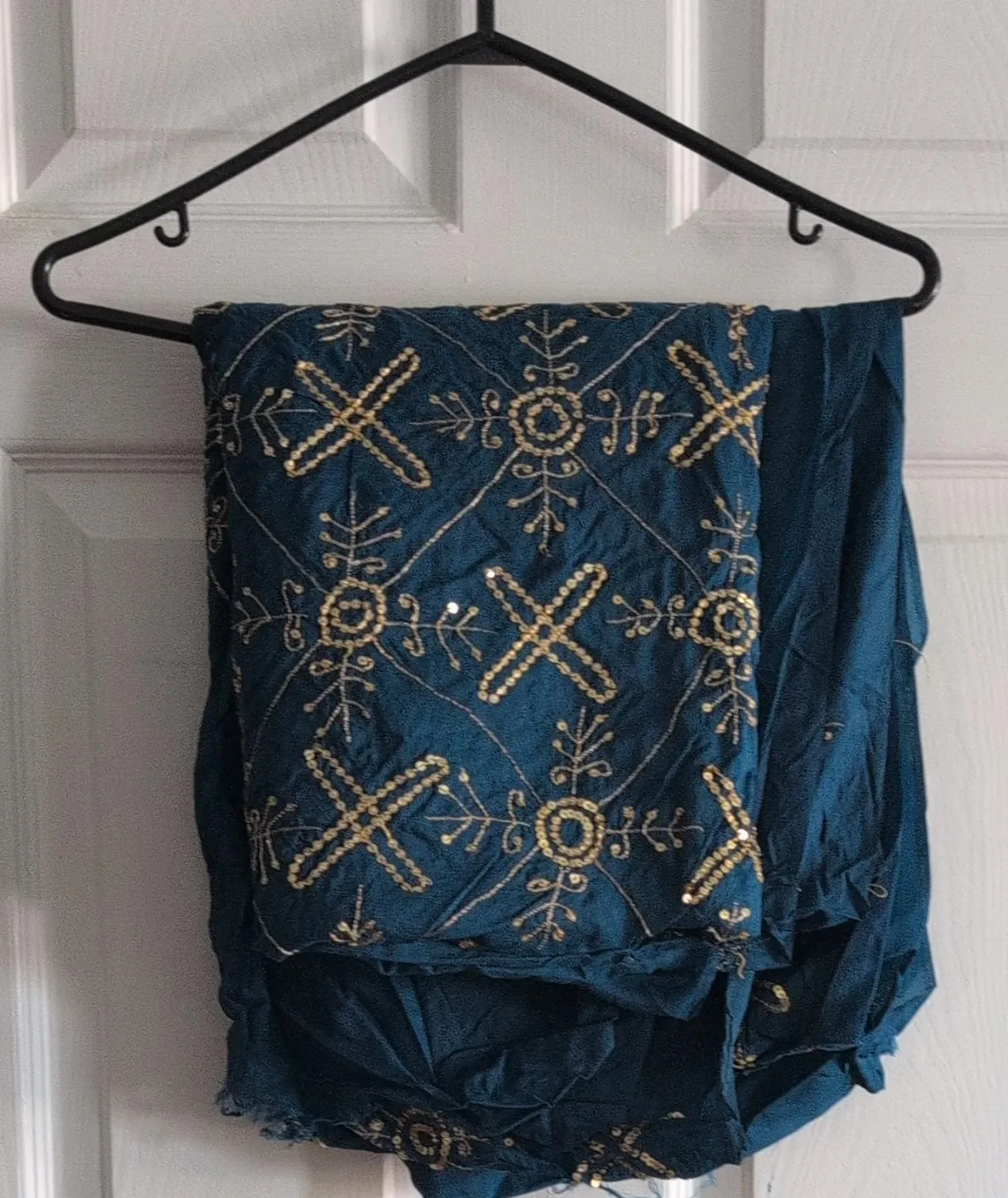 Teal coloured saree with gold embroidery and sequins. It's a beautiful traditional outfit. Material is lightweight and flowy. It's perfect for festive occasions.