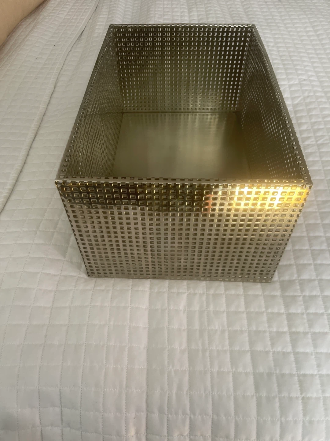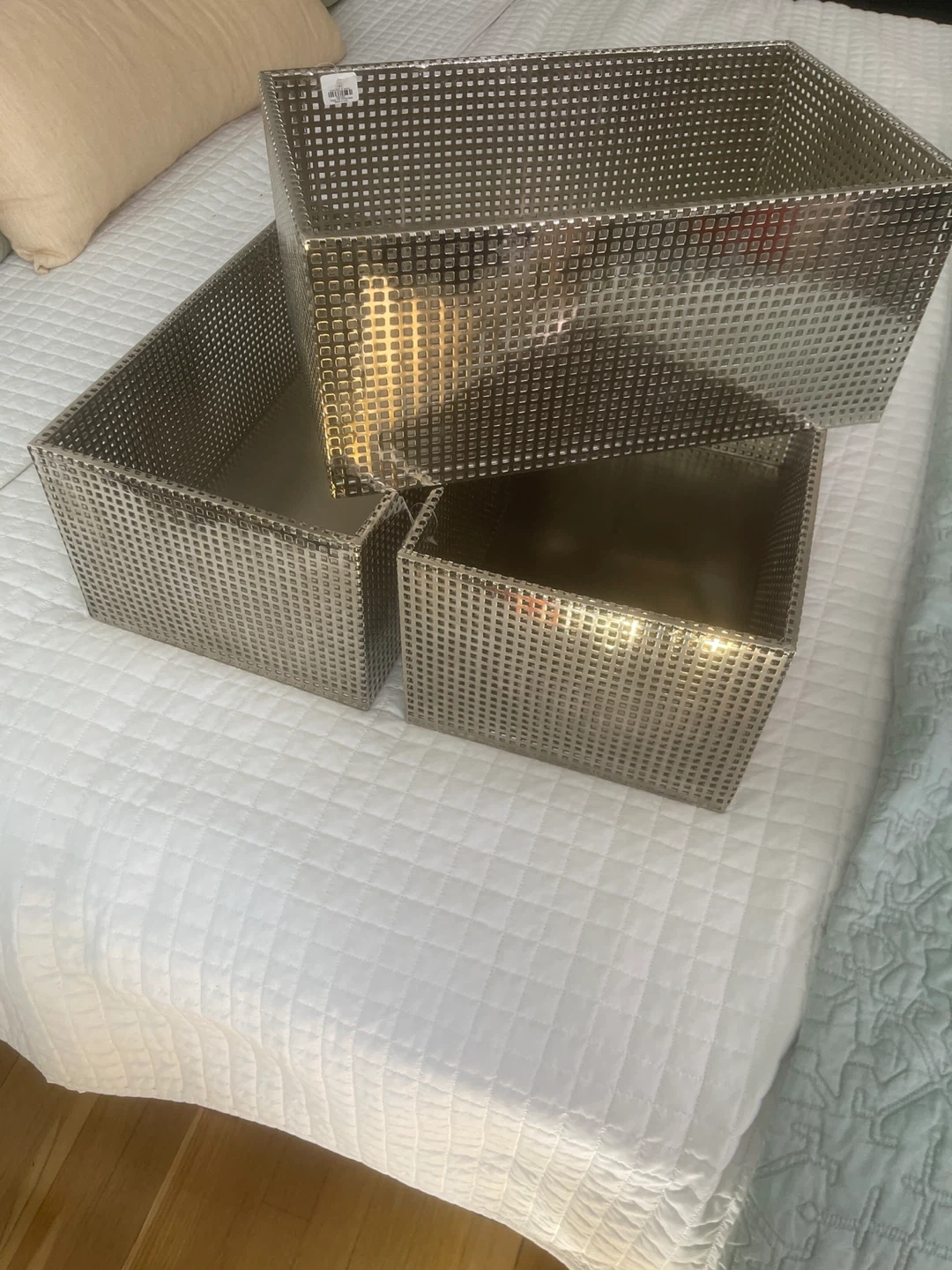 This set includes three decorative storage baskets in a shiny silver finish. They're made of a durable metal with a perforated grid design. Great for organizing items on shelves or in closets!