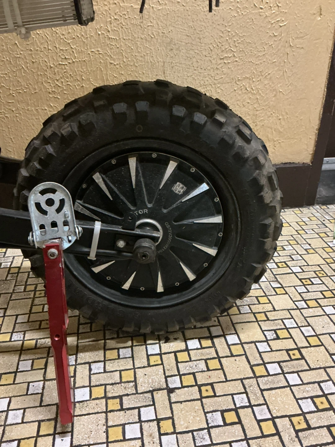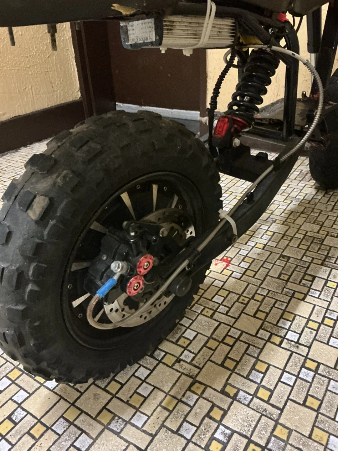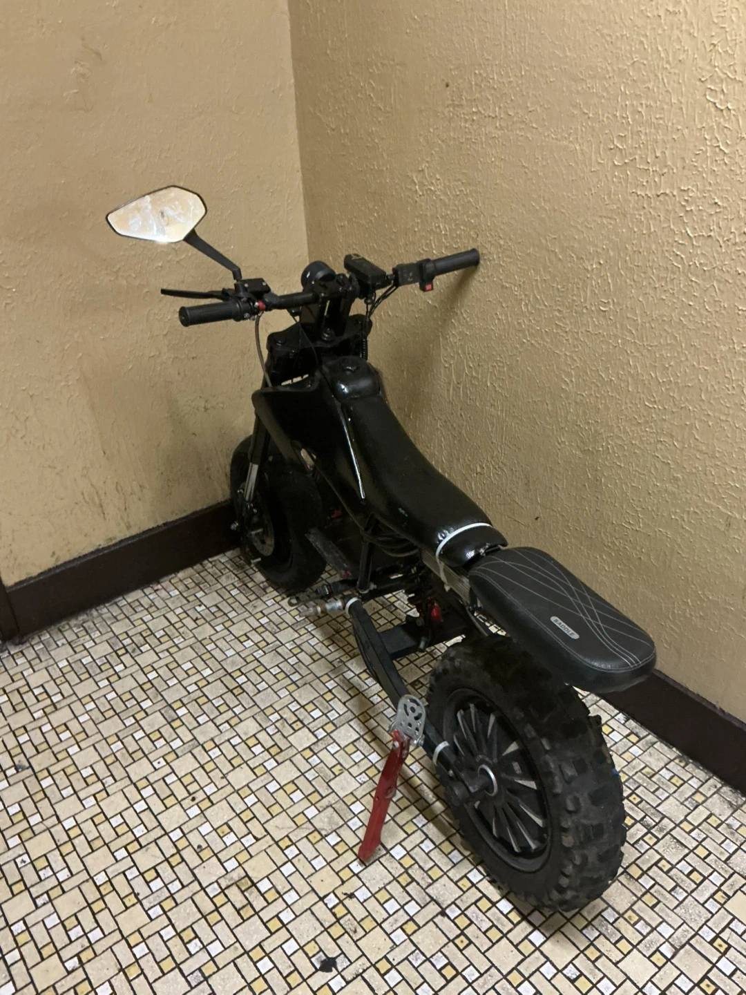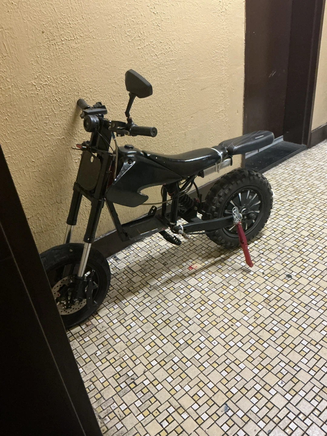 This is a black electric scooter styled like a motorcycle. It features knobby tires for off-road use and a sturdy frame. The scooter has a rear disc brake and a front suspension system.