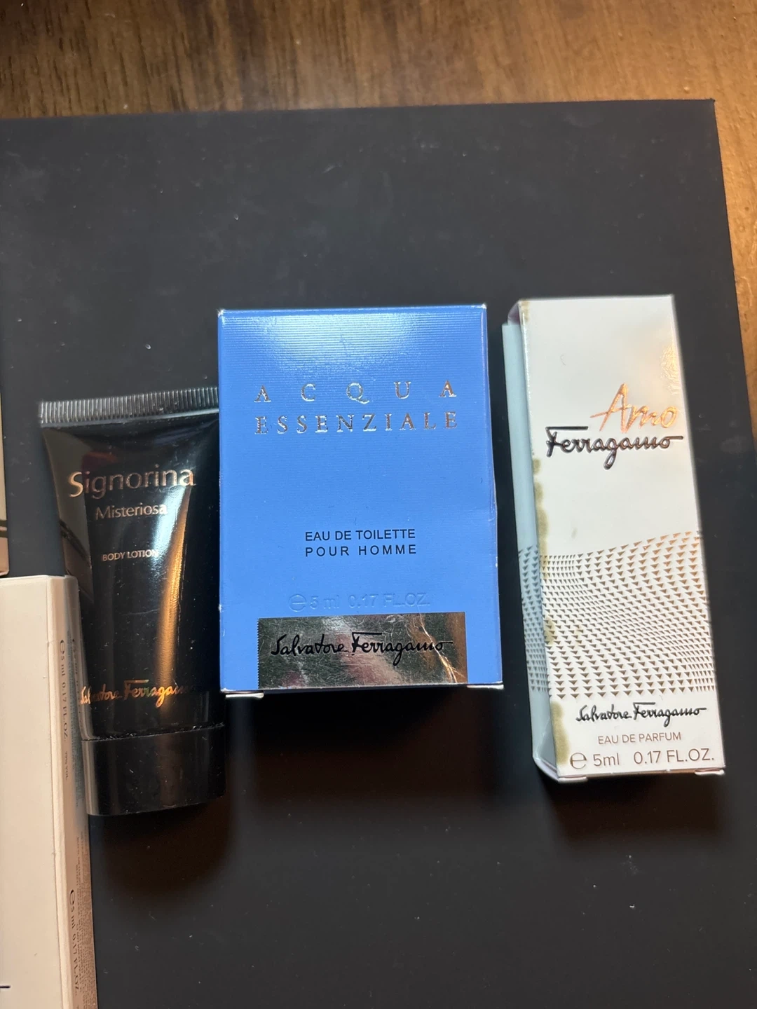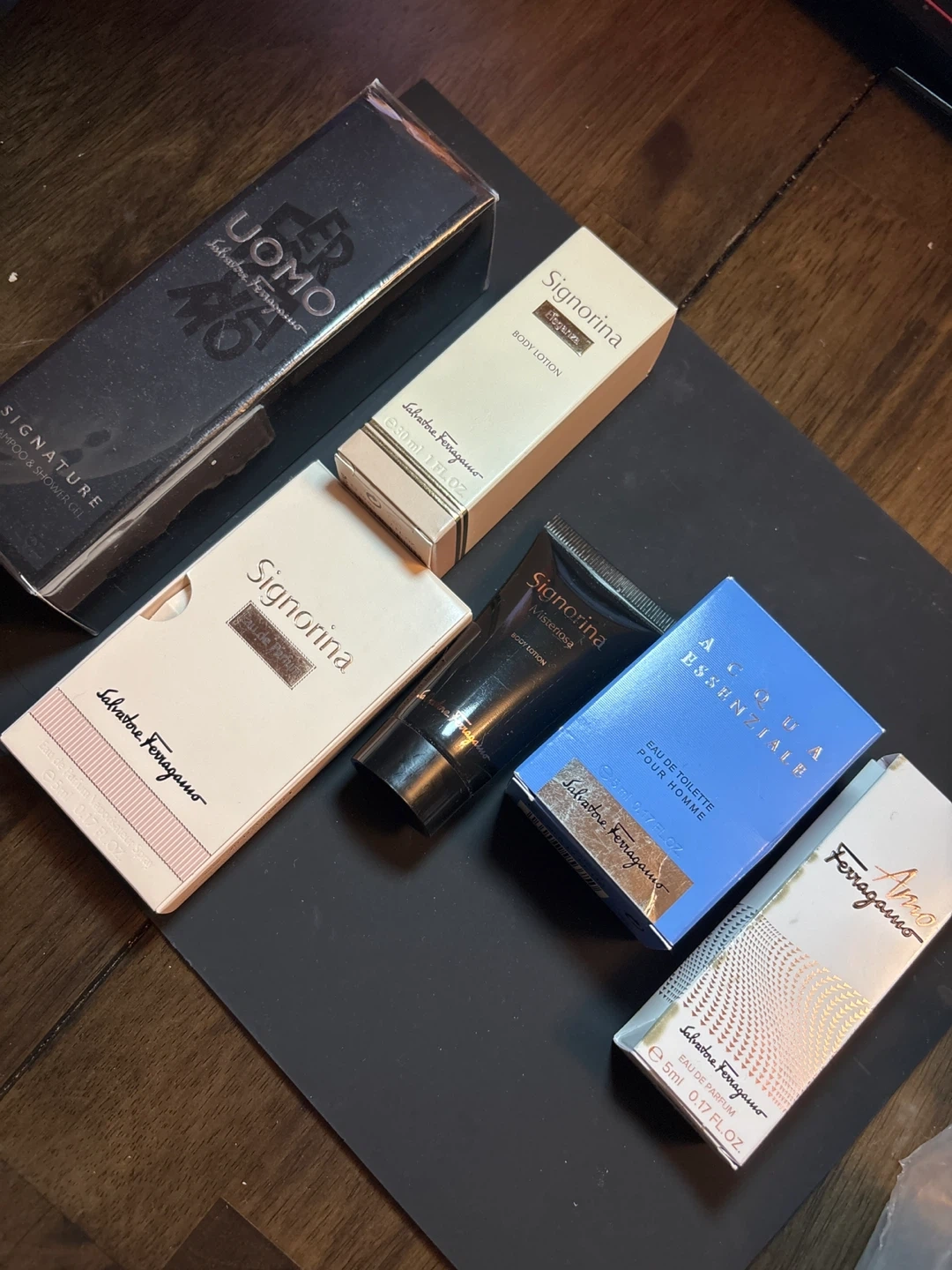 Set includes Salvatore Ferragamo Signorina Body Lotion (30ml), Acqua Essenziale Eau de Toilette (5ml), and Amo Ferragamo Eau de Parfum (5ml). Also includes Salvatore Ferragamo Uomo Shampoo & Shower Gel (unknown volume). Perfect for trying out different scents!