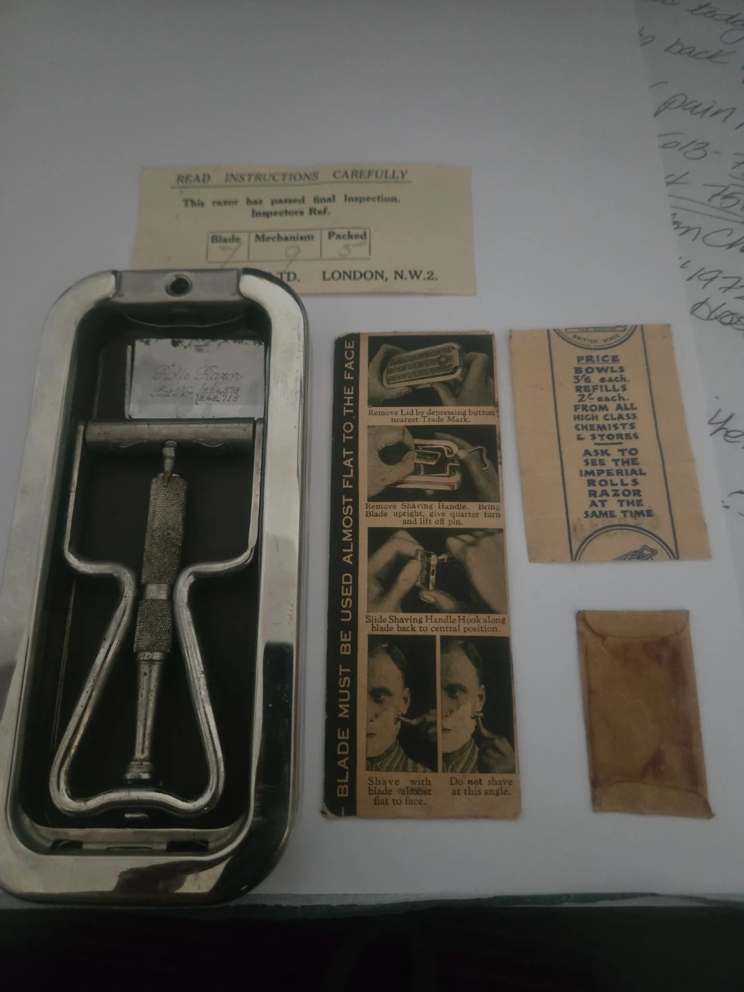 This is a vintage Rolls Razor safety razor with its original case and instructions. It includes the razor, an instruction booklet, and a price list from the manufacturer, Rolls Razor Ltd. London, N.W.2. The razor's mechanism and packed status are marked as '9'.