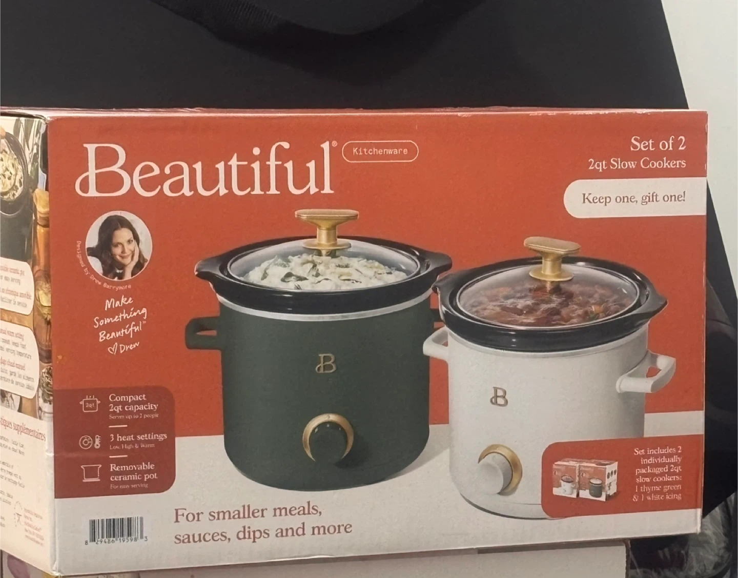 This set includes two Beautiful 2qt slow cookers, one in thyme green and one in white icing. They feature compact 2qt capacity and have 3 heat settings (Low, High, Warm). The removable ceramic pots make serving easy!