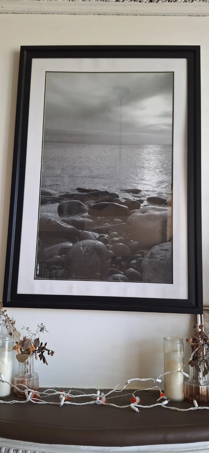 Framed black and white photograph depicting a rocky shoreline with gentle waves. It's a serene landscape piece ready to enhance any room. Black frame included.